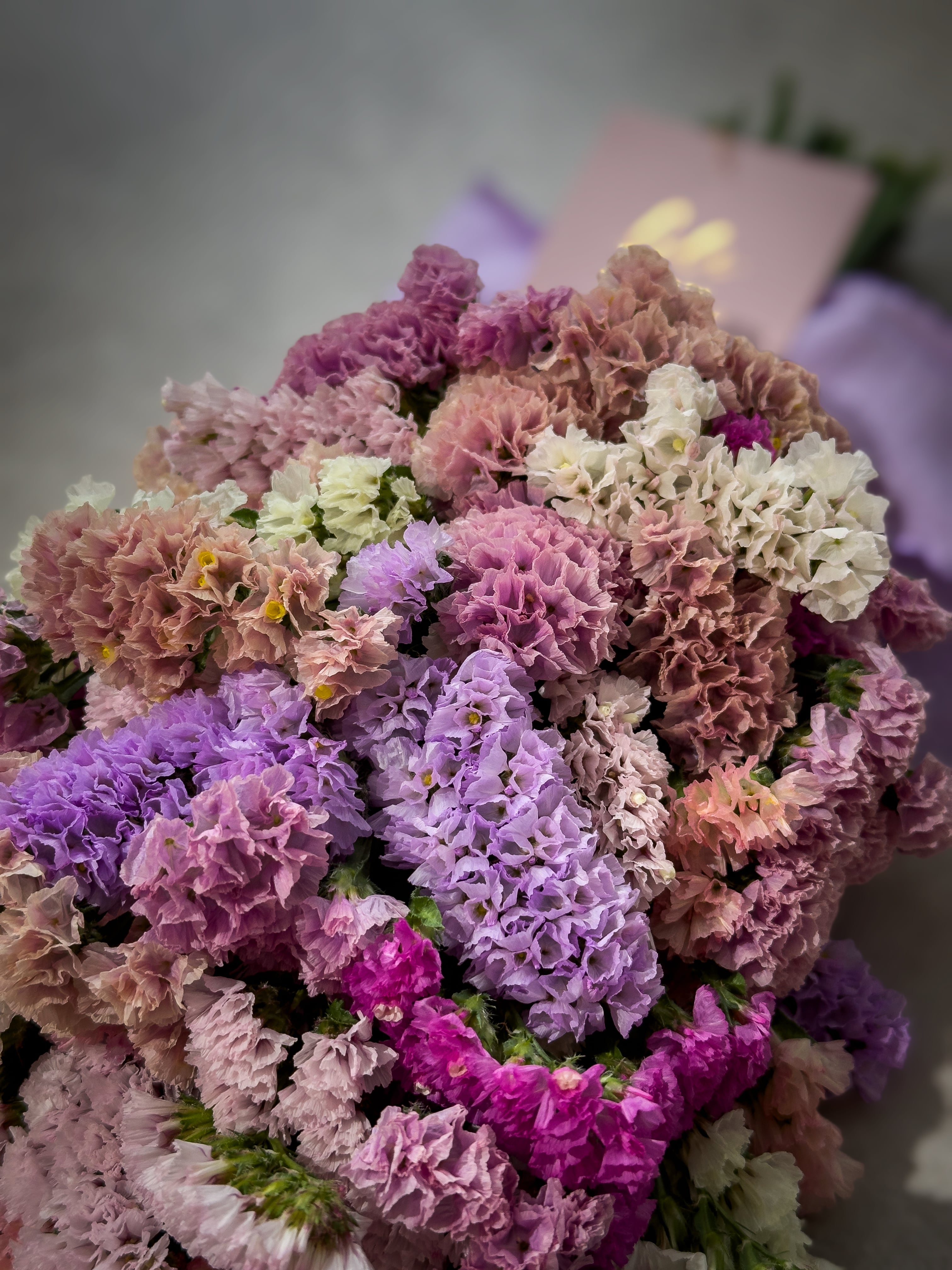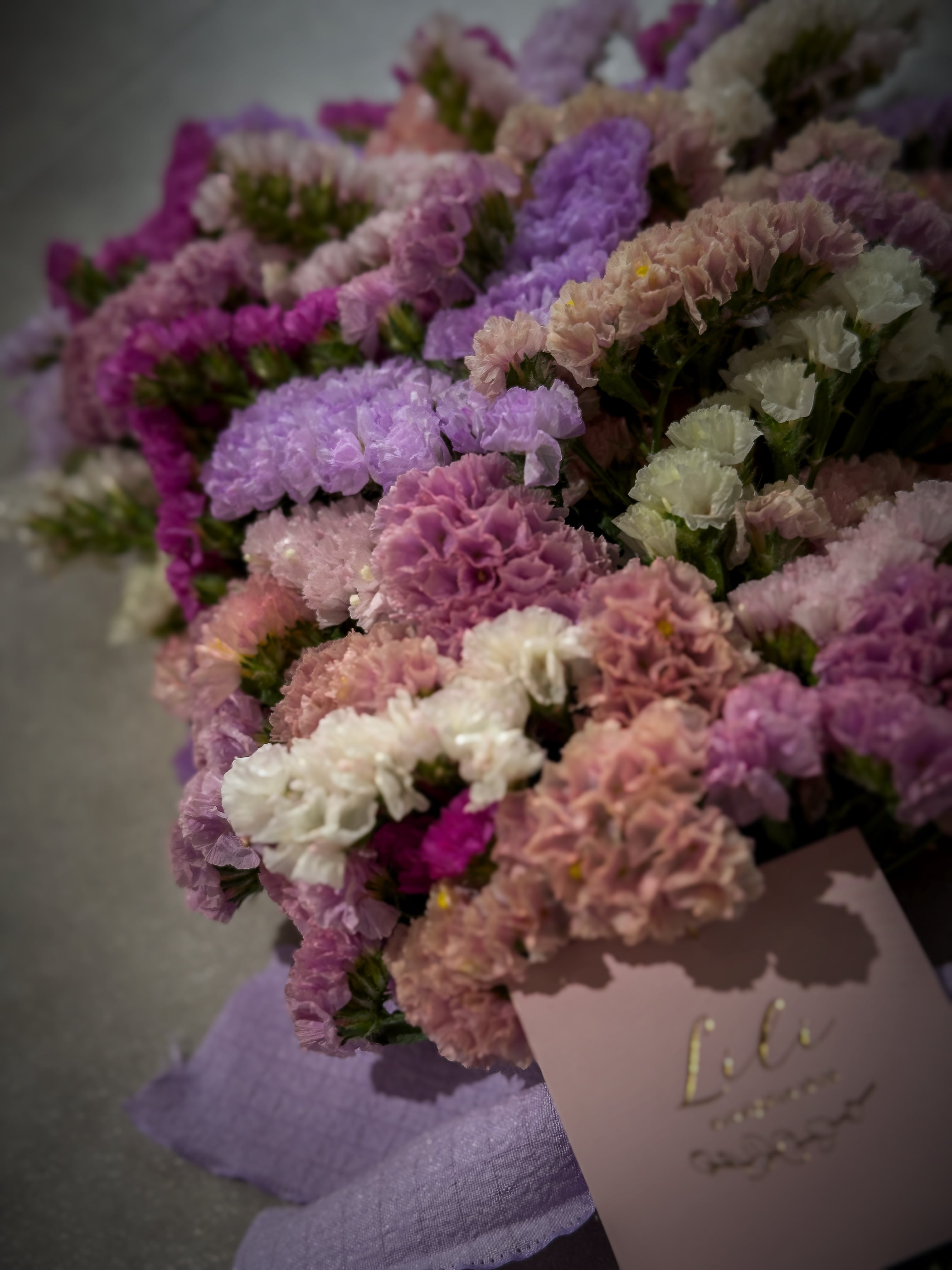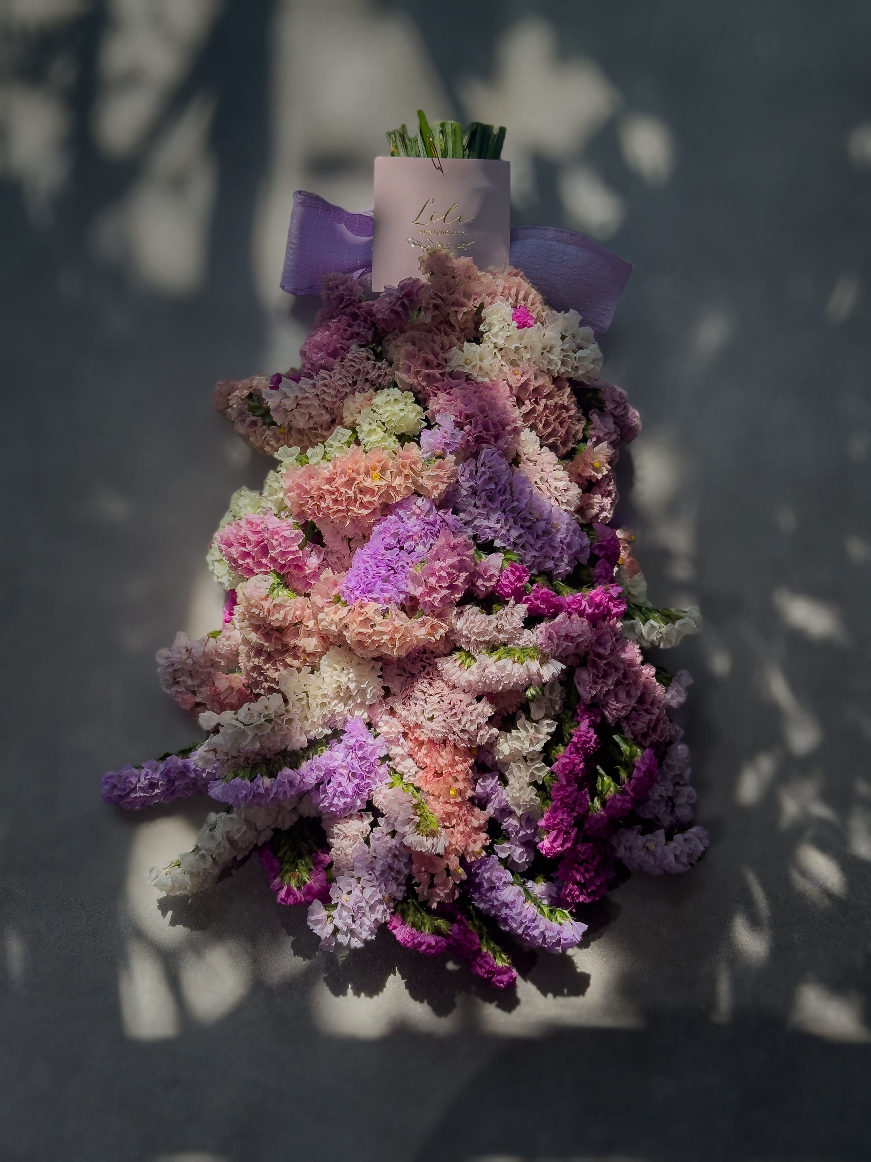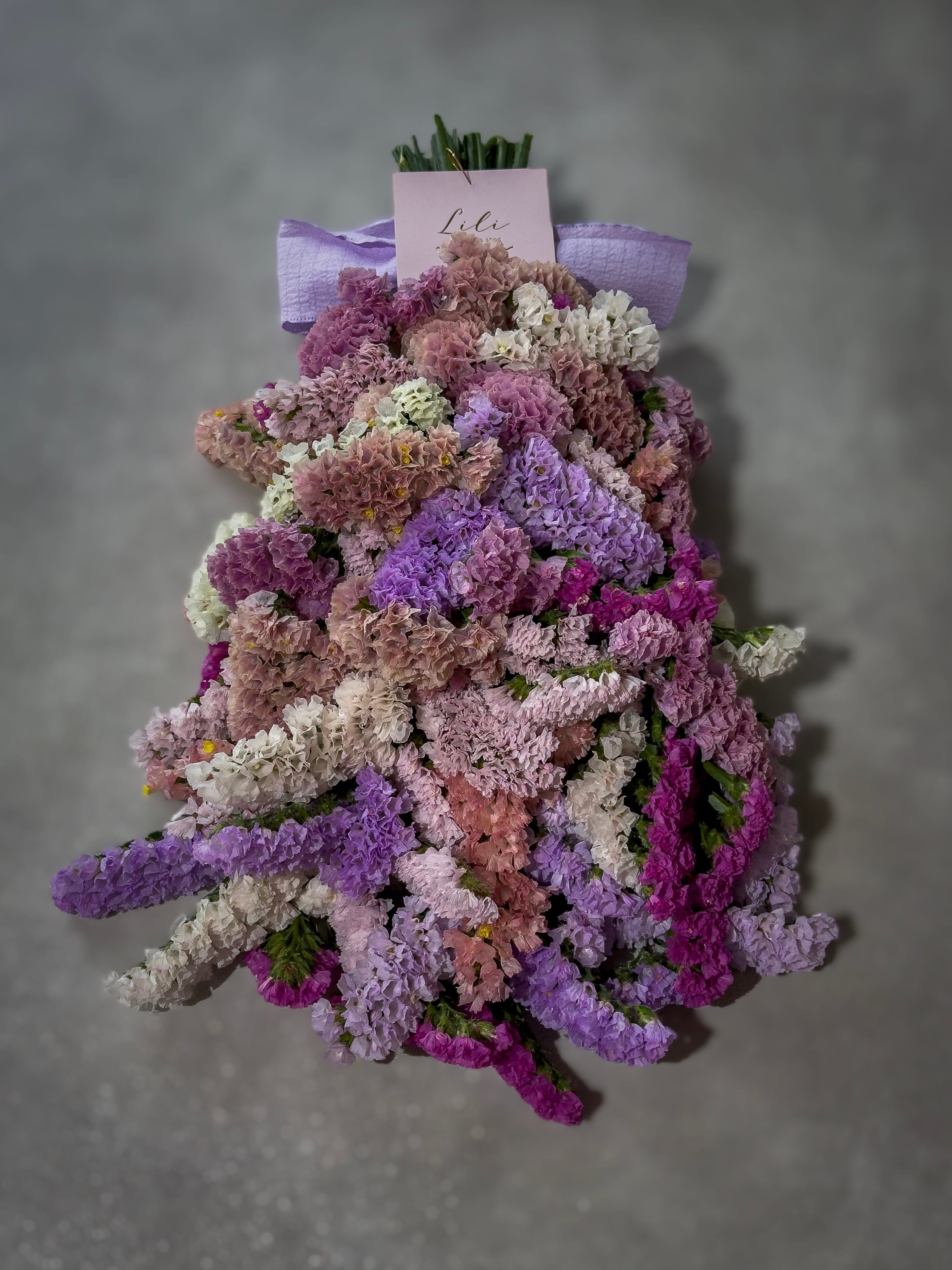 お花の絨毯みたいになるようにぎっしり下までスターチスを束ねてます♡