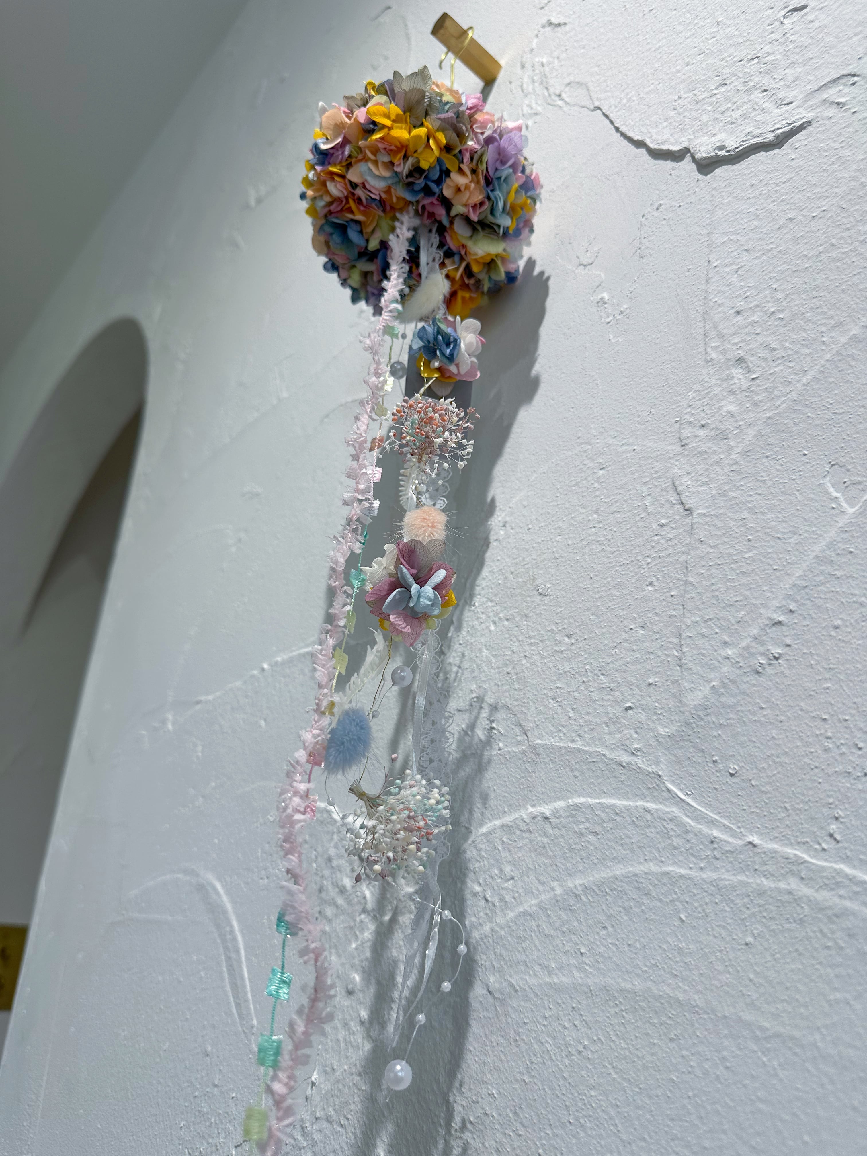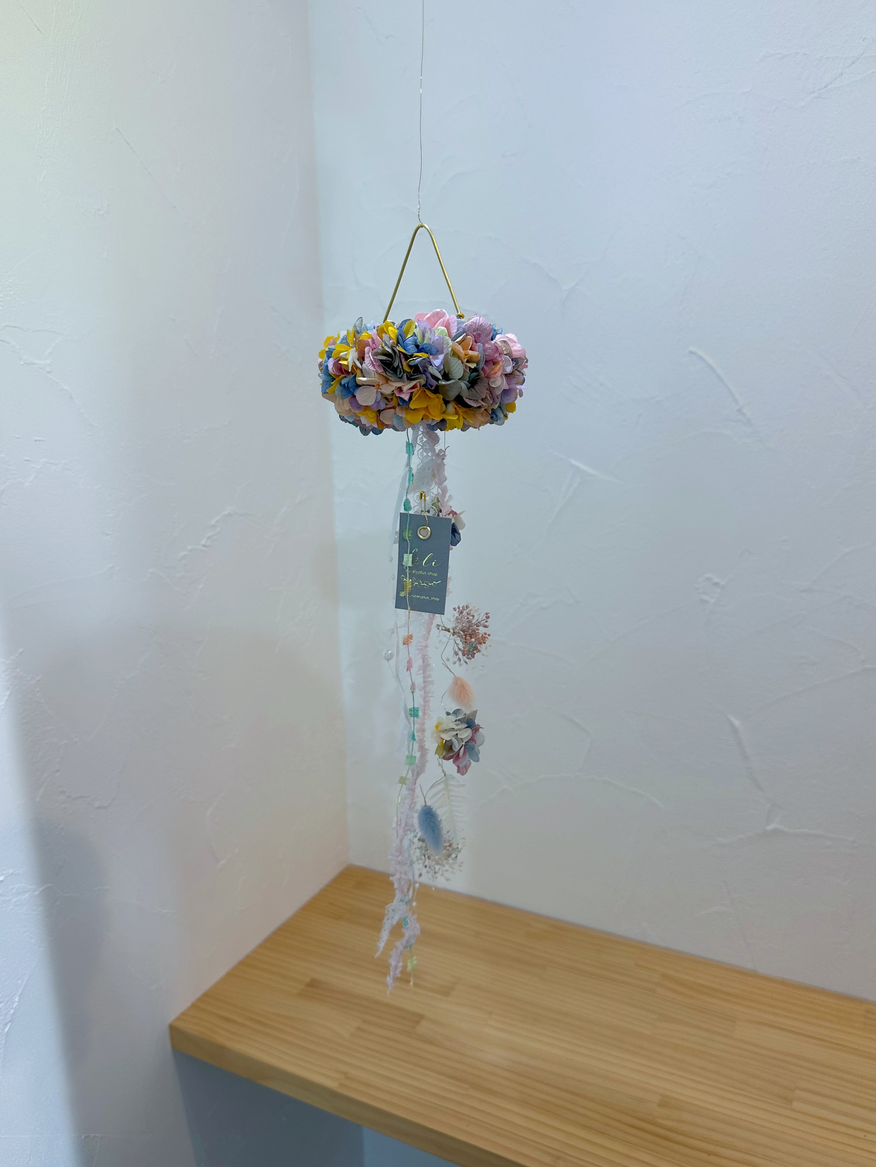 長めの真鍮フック、フラワーモビール、ぶら下げる高さを調節出来るように細い真鍮ワイヤー、リボン5種類付き