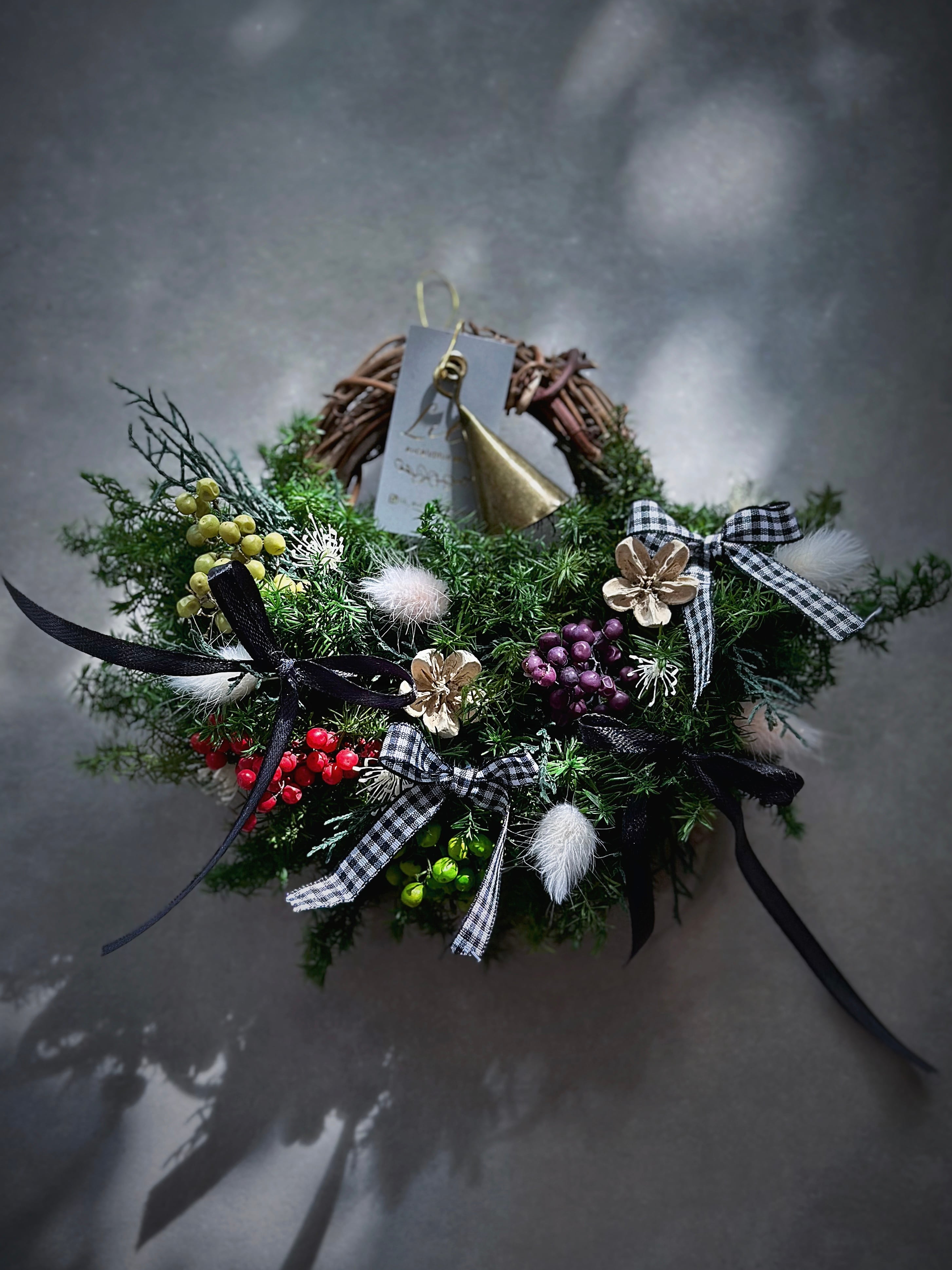 ✔ハーフリース (22cm程) 真鍮フック、リボン、クリスマスタグ付き この時期にピッタリのハーフリース 全てプリザーブドフラワーで制作しておりますので長い期間楽しんでいただけます♡