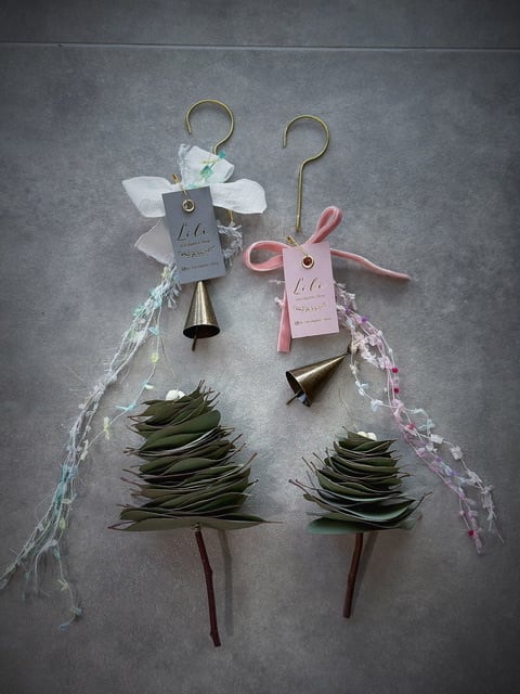 ※再販商品は写真を変更しております。 ✔ユーカリミルフィーユのツリー 2個set (ツリー15cm、11cm程) 真鍮フック、リボン数種類、クリスマスタグ付き サイズ違いでぶら下げるとめっちゃ可愛くて、お得な2個セットにしてみました♡♡