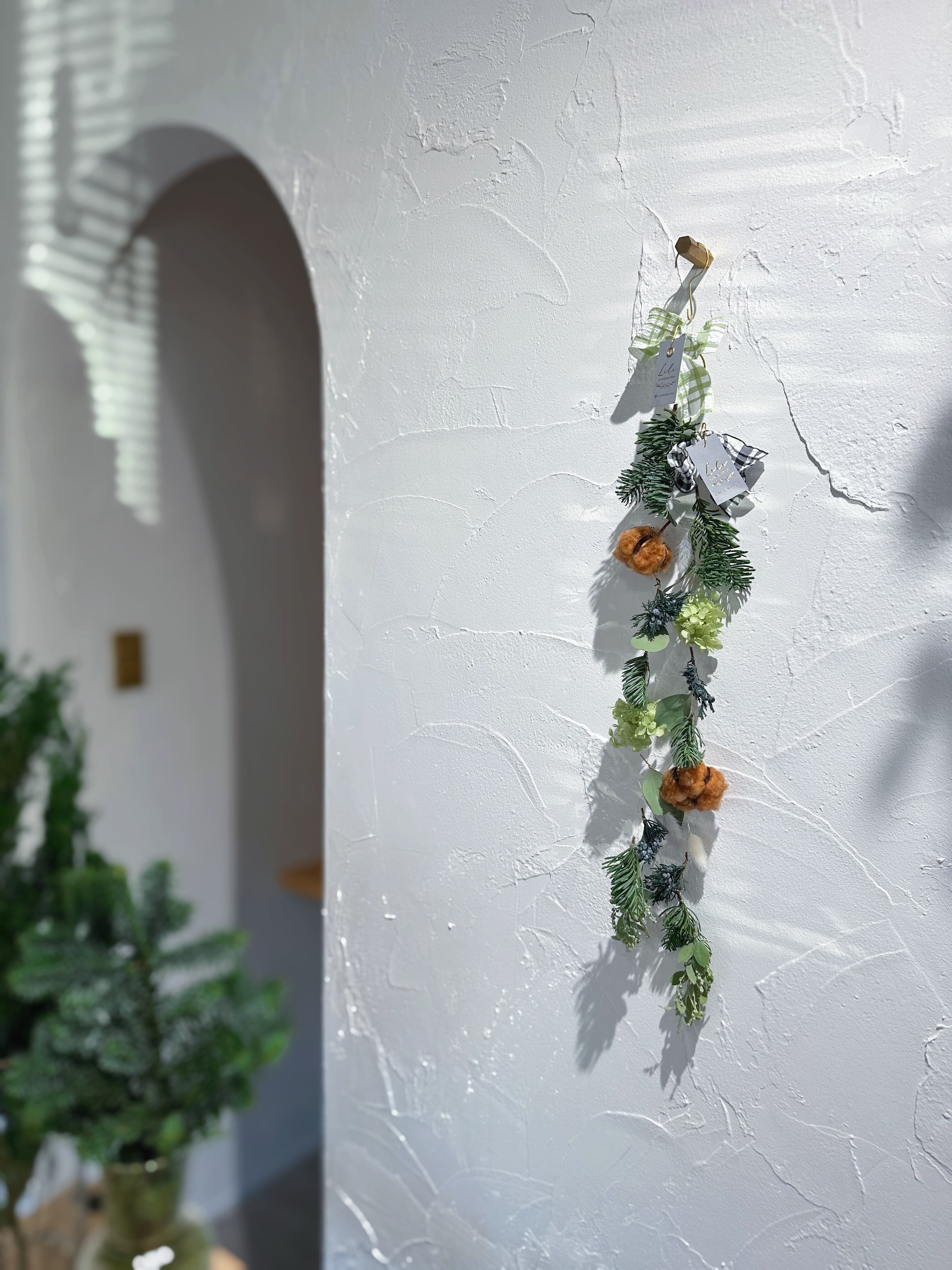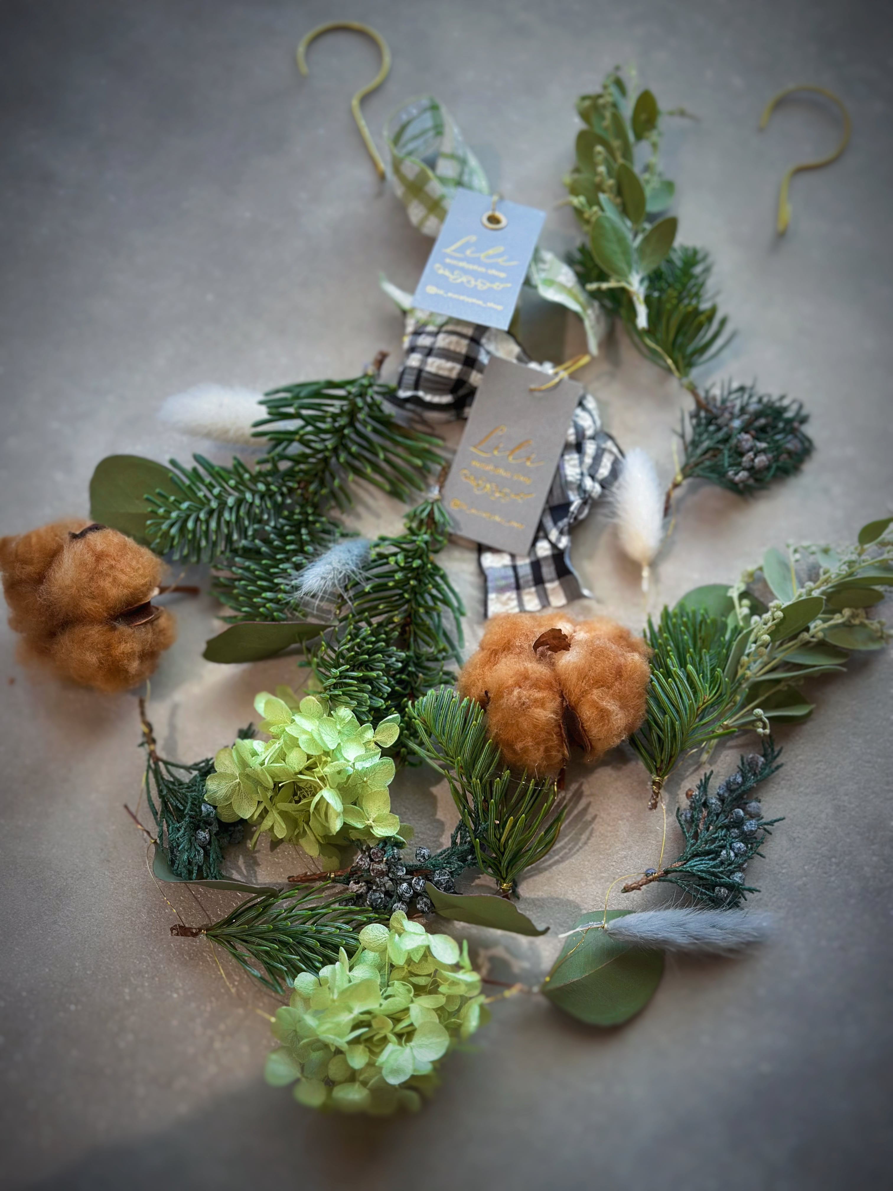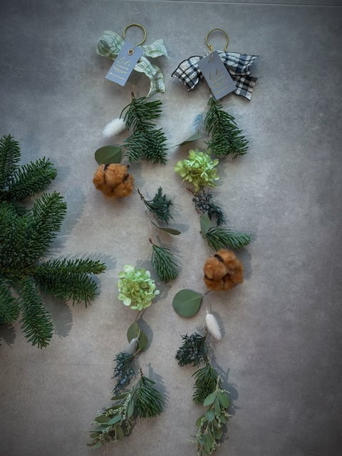 ✔フラワーモビール 2個set (上から下まで50cm程) 香りの良いモミの木と、ブラウンのコットンフラワー、グリーン紫陽花がとっても可愛い♡ 実付きのマウンテンジュニパー、ユーカリ、ラグラス、パールアカシア蕾付き葉も♡♡