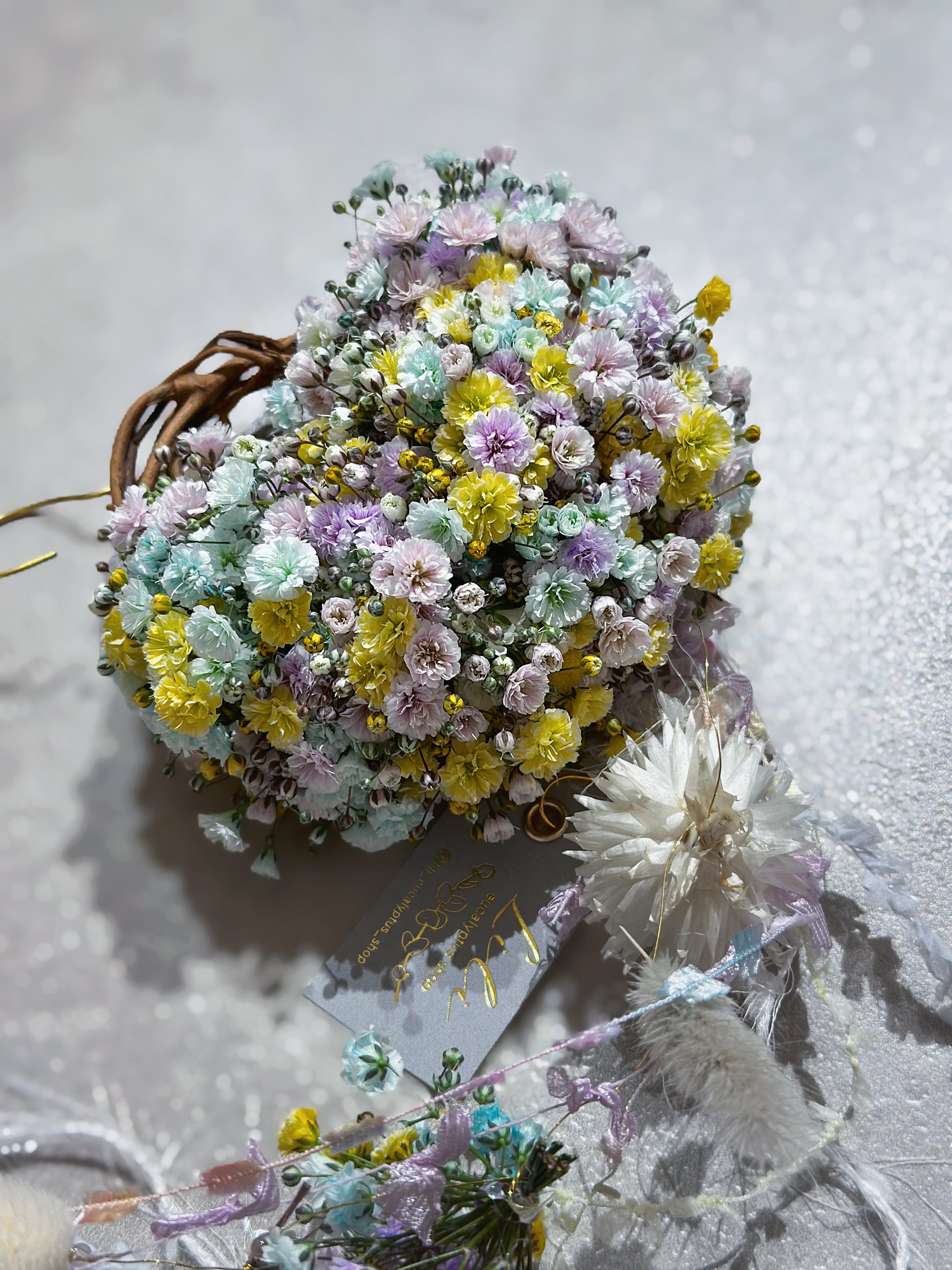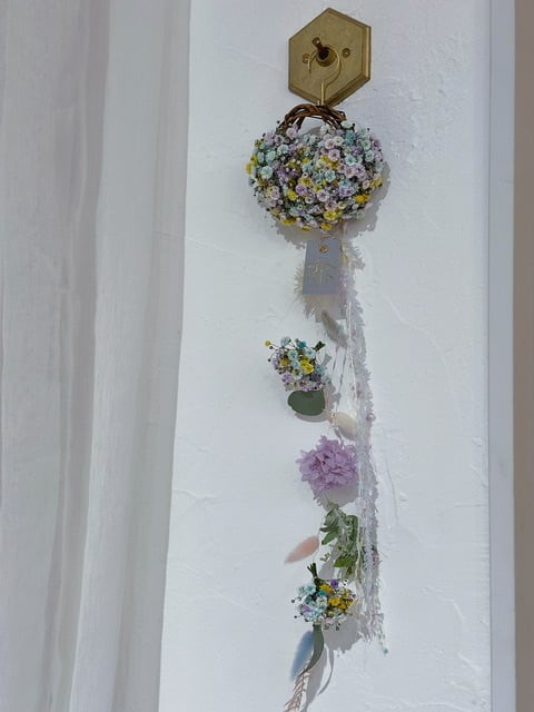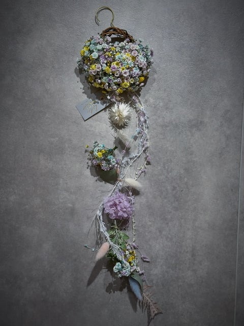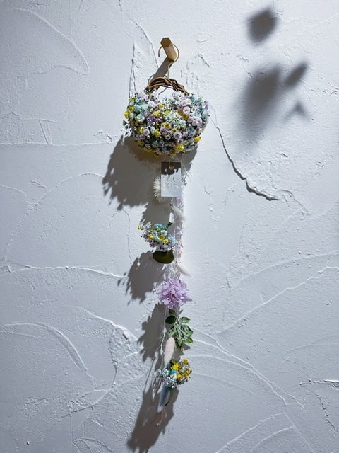 ✔miniハーフリースのフラワーモビール (リース12cm、上から下まで60cm程) パステルパープル、パステルブルー、イエロー、ホワイト混ぜ♡ 真鍮フック付き ※生花からドライになる商品になりますので、翌日発送しますので受け取りができる方のみのご購入でお願いいたします。 ※花の大きさや、仕入れ価格で変動あります。