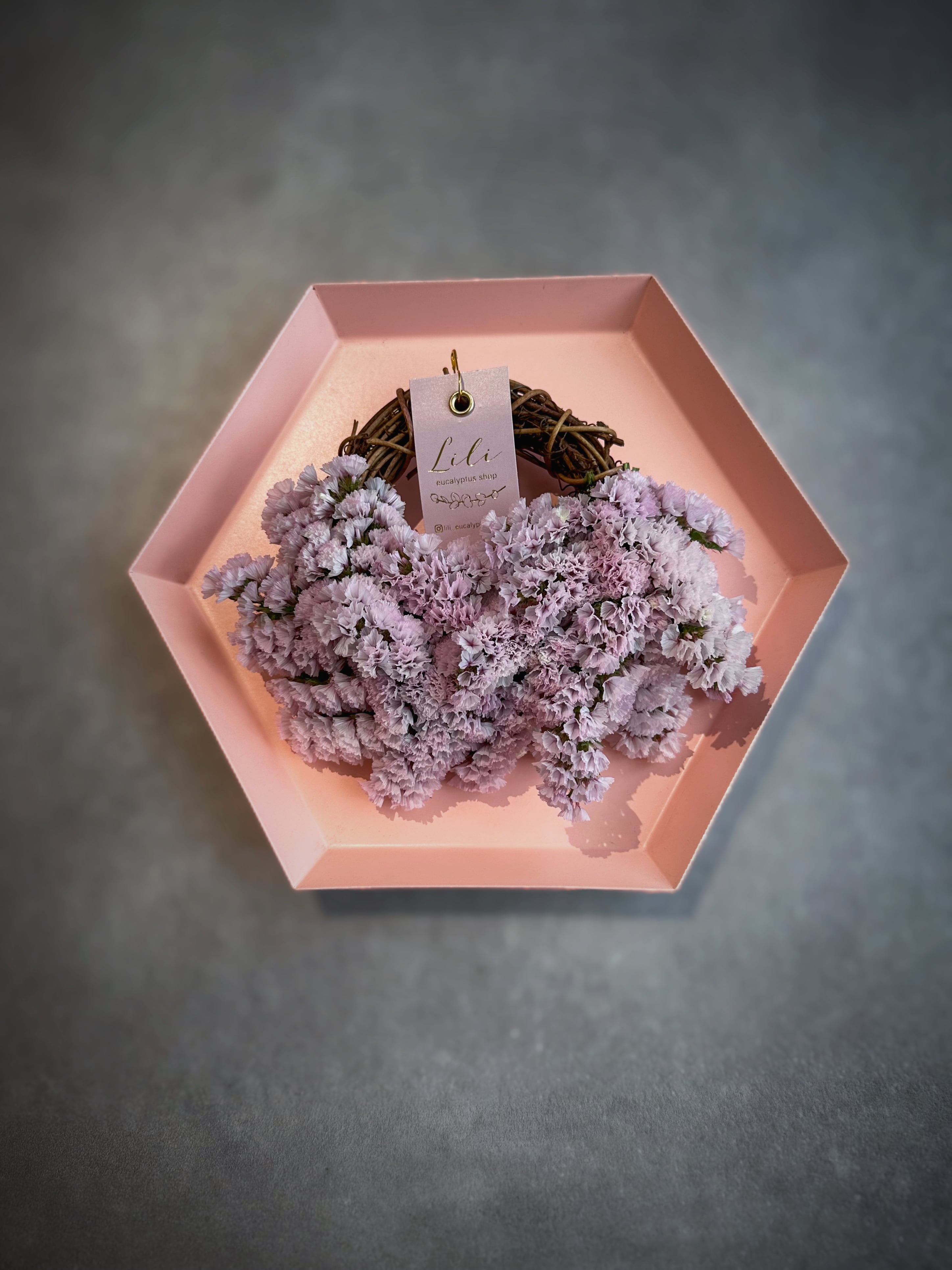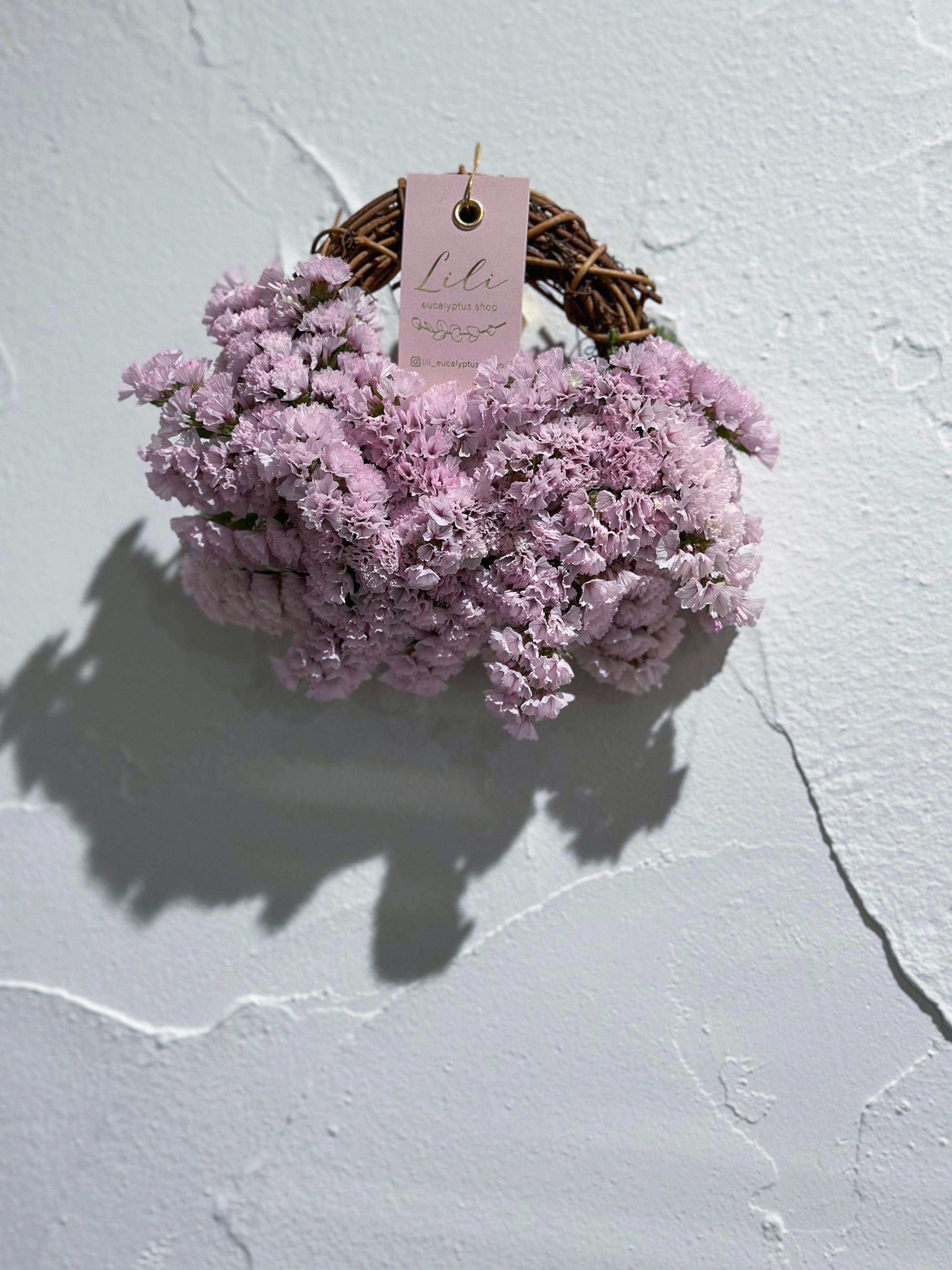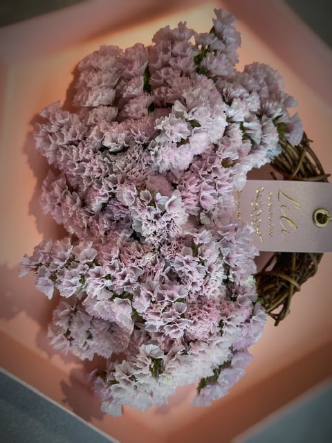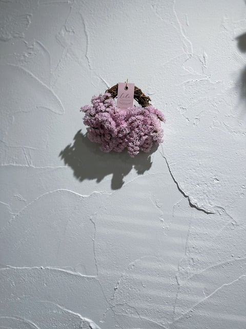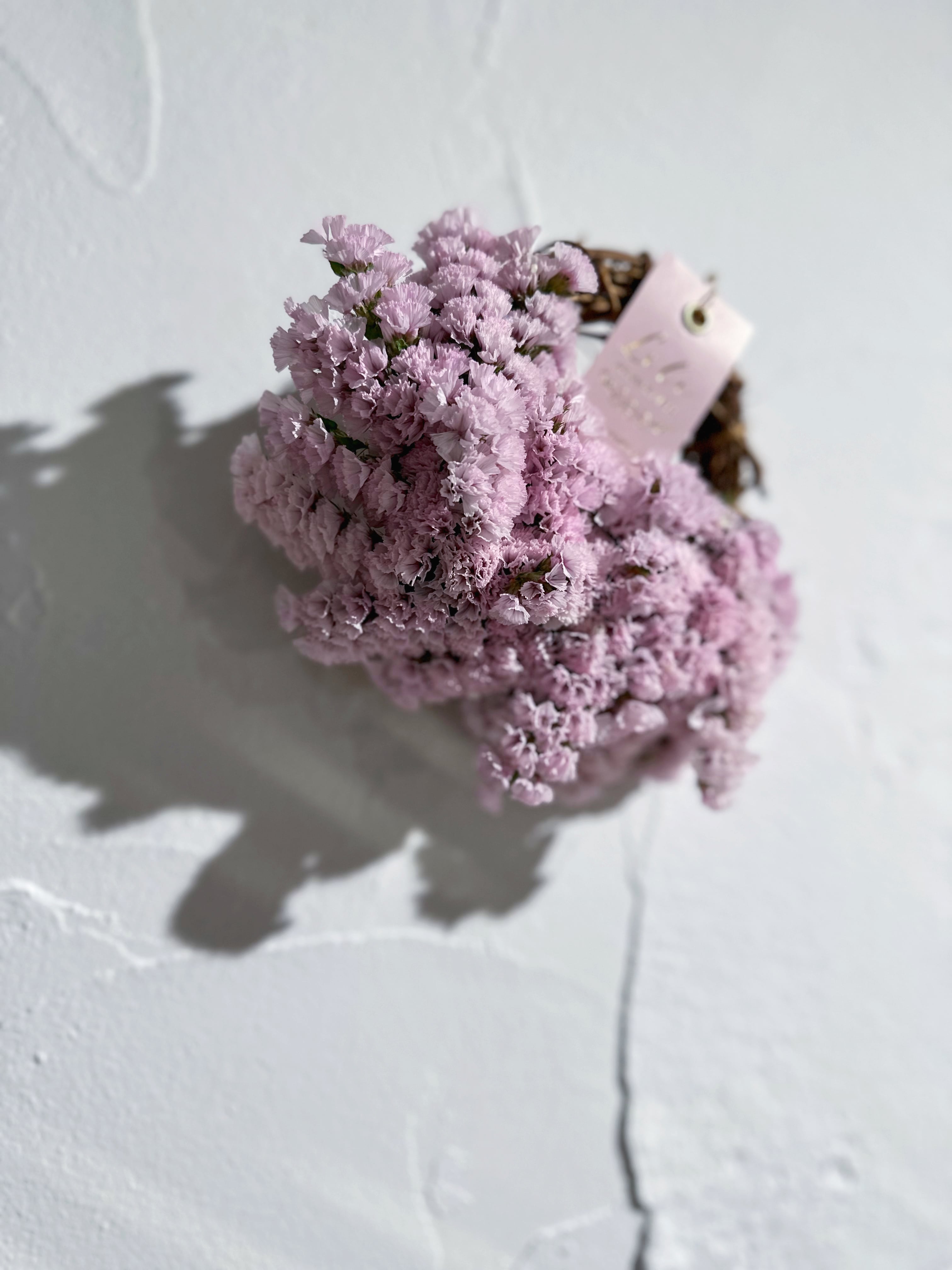 壁掛けリース (横17cm前後) スターチス〈さくらふわり〉を使用した、 とっても可愛い色味の小さめリースです♡ ふんわり優しい雰囲気に仕上がりました♡