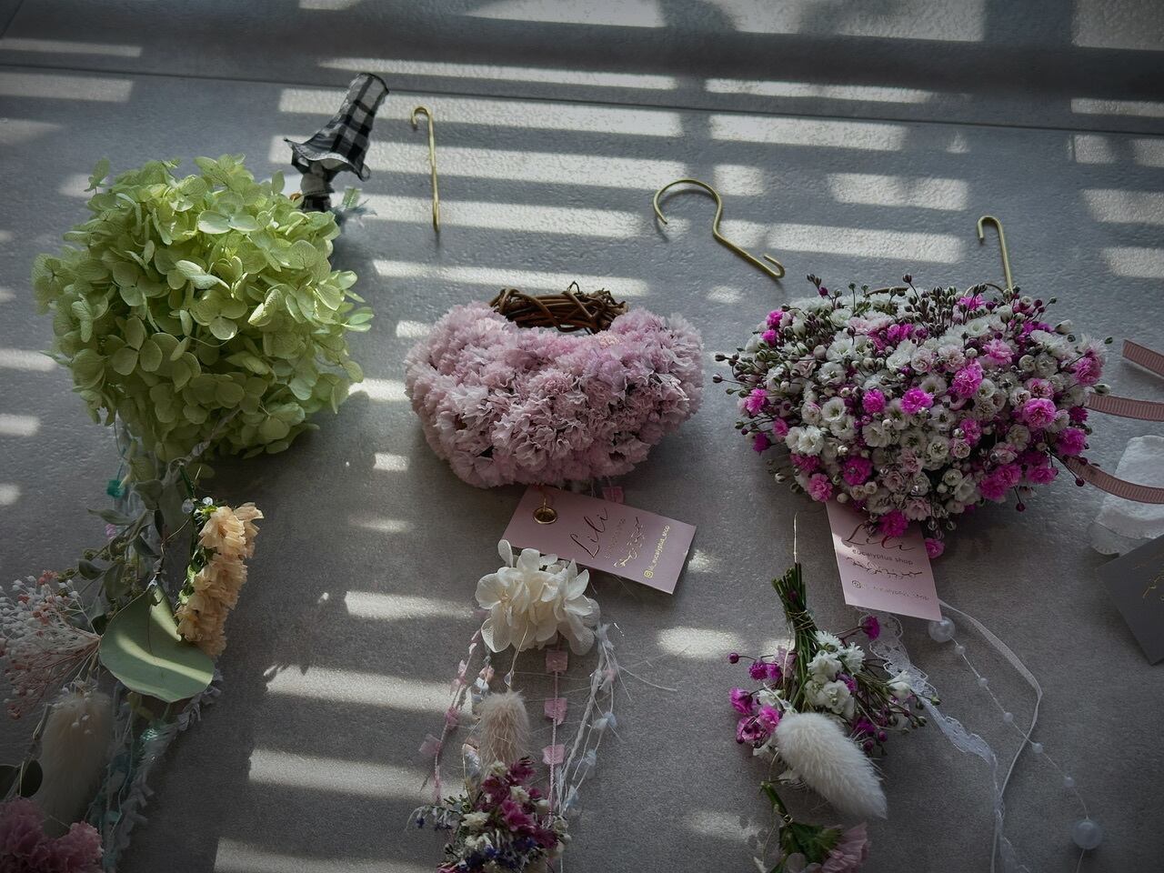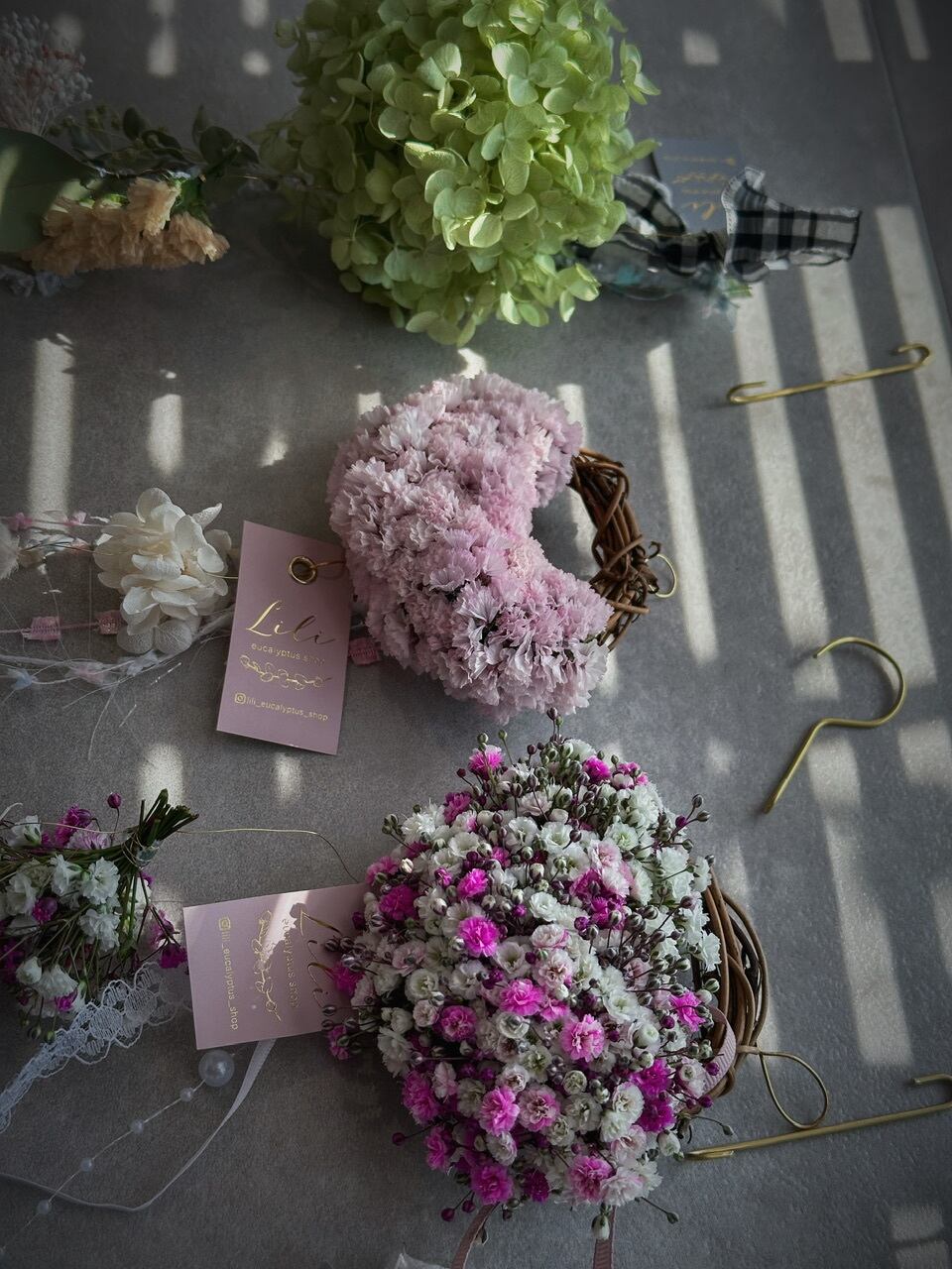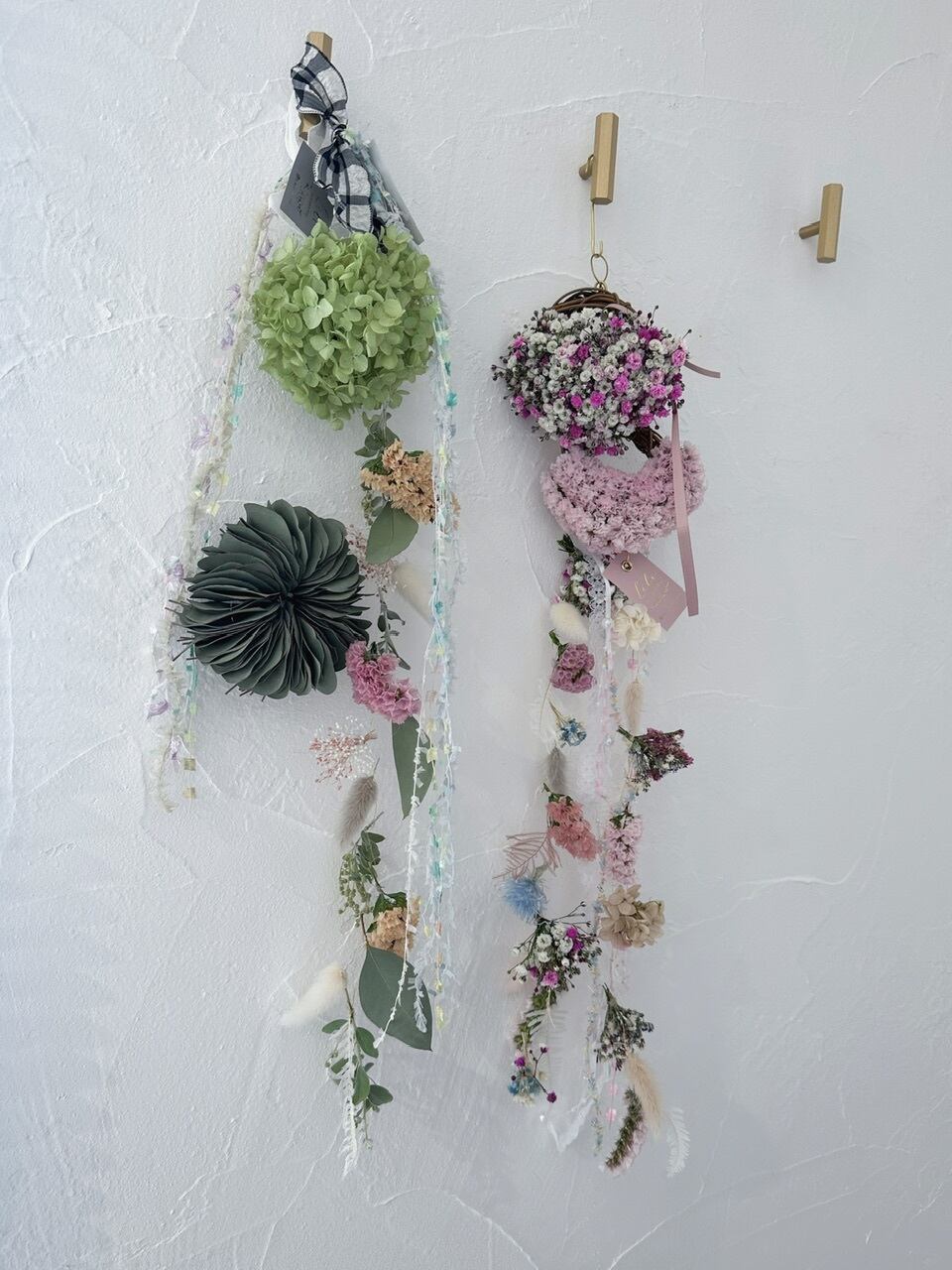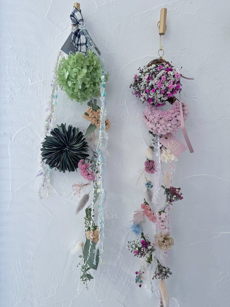 ※こちらはおまとめ注文専用のリクエストページになります。 ▼ ✔miniリースのフラワーモビール (スターチスさくらふわり) ✔miniかすみ草のフラワーモビール (ホワイト×ピンク) ✔ユーカリミルフィーユ ✔アナベルフラワーモビール