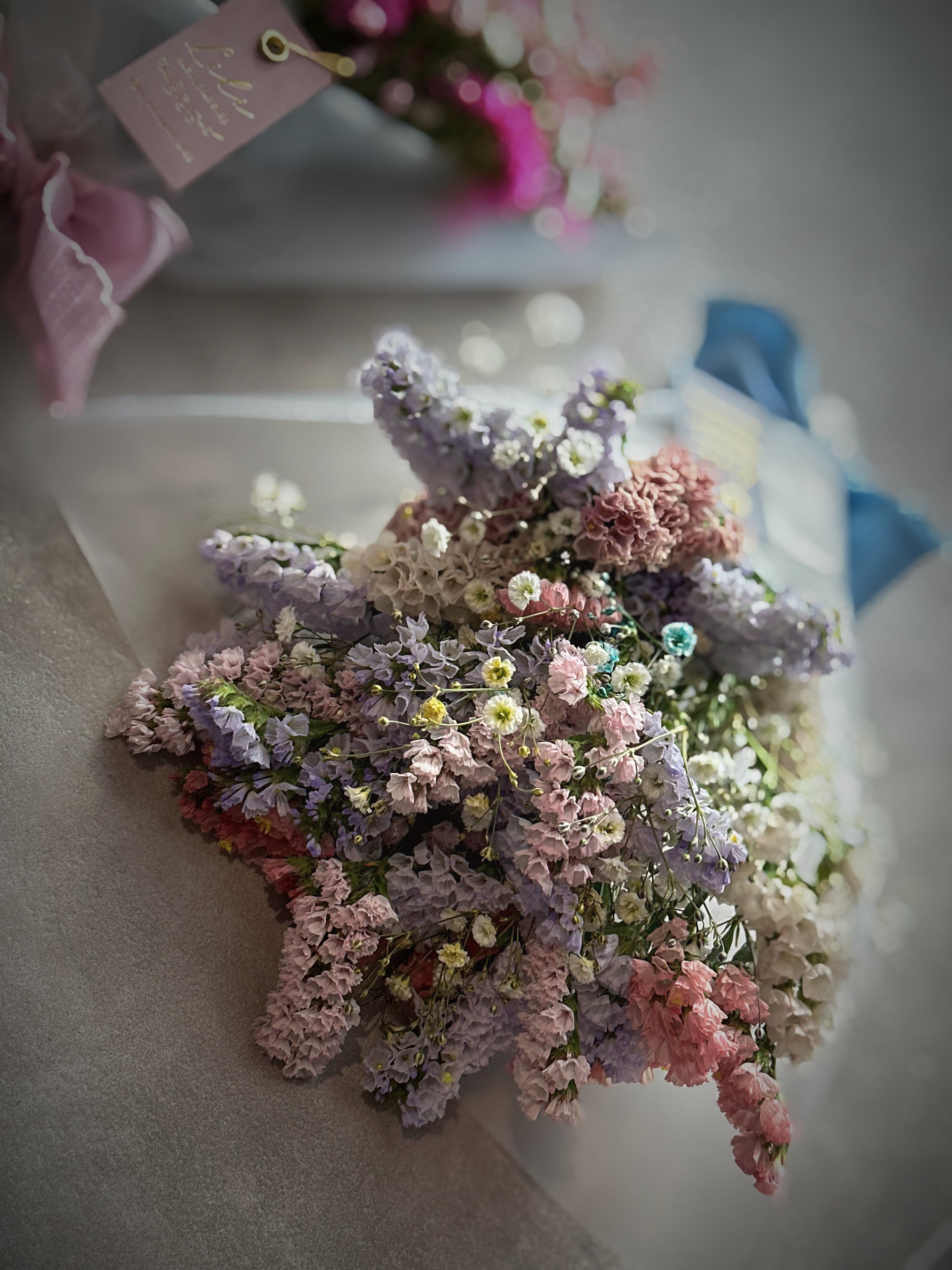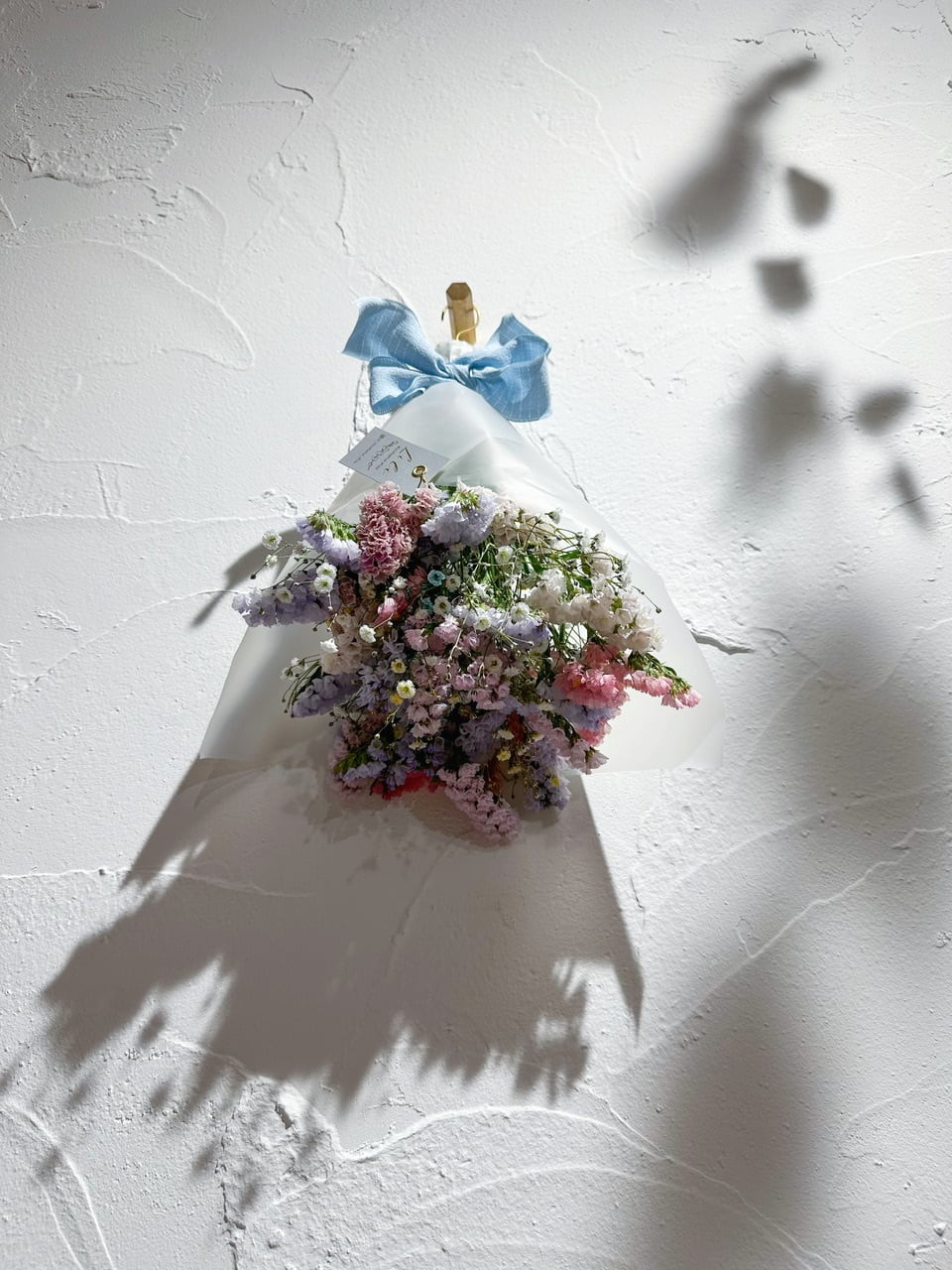 ✔ミルキーカラースワッグ (27cm前後) スケルトンラッピングなので中が透けていて とっても可愛いです♡ 最後のページのように下から麻紐の輪っかを出せるので ラッピングしたままでも飾って頂けます。 真鍮フック付き