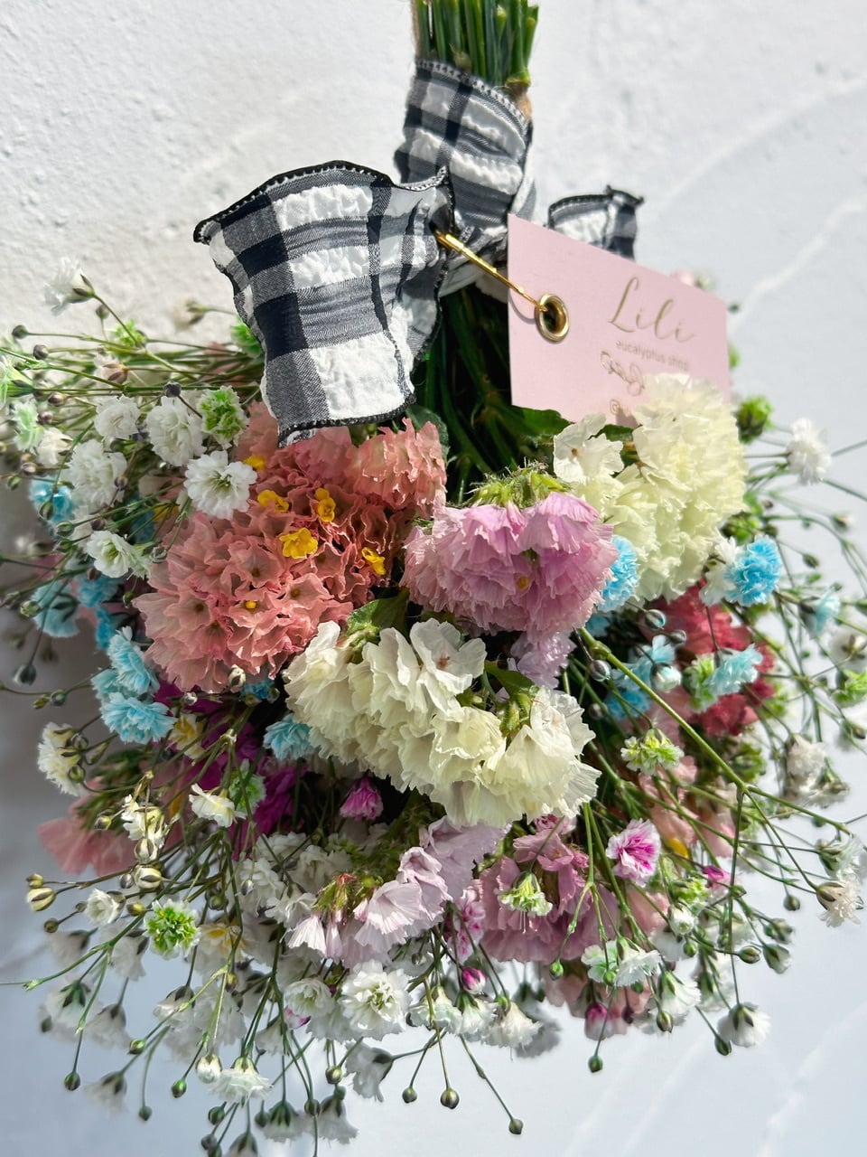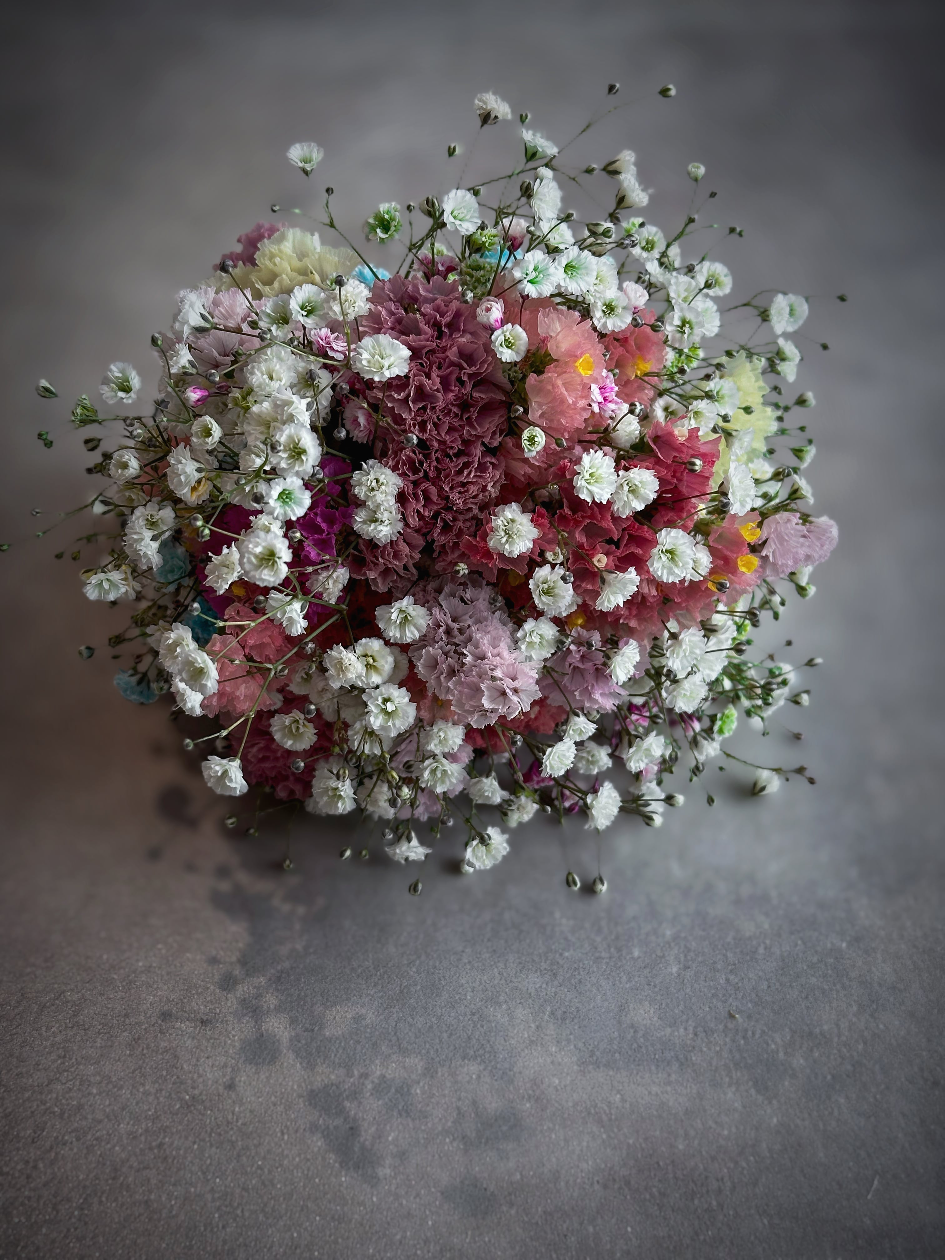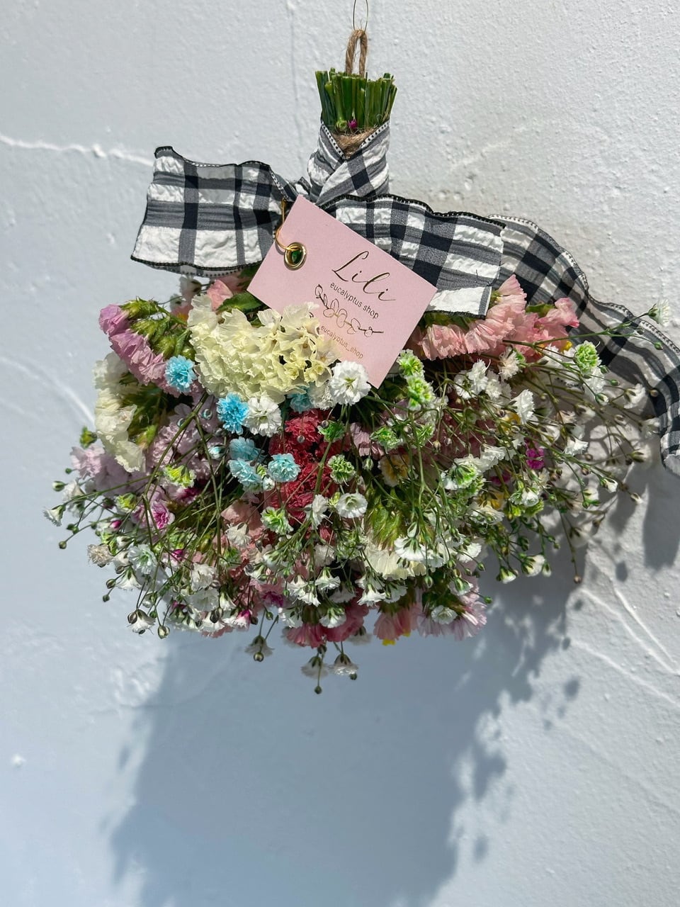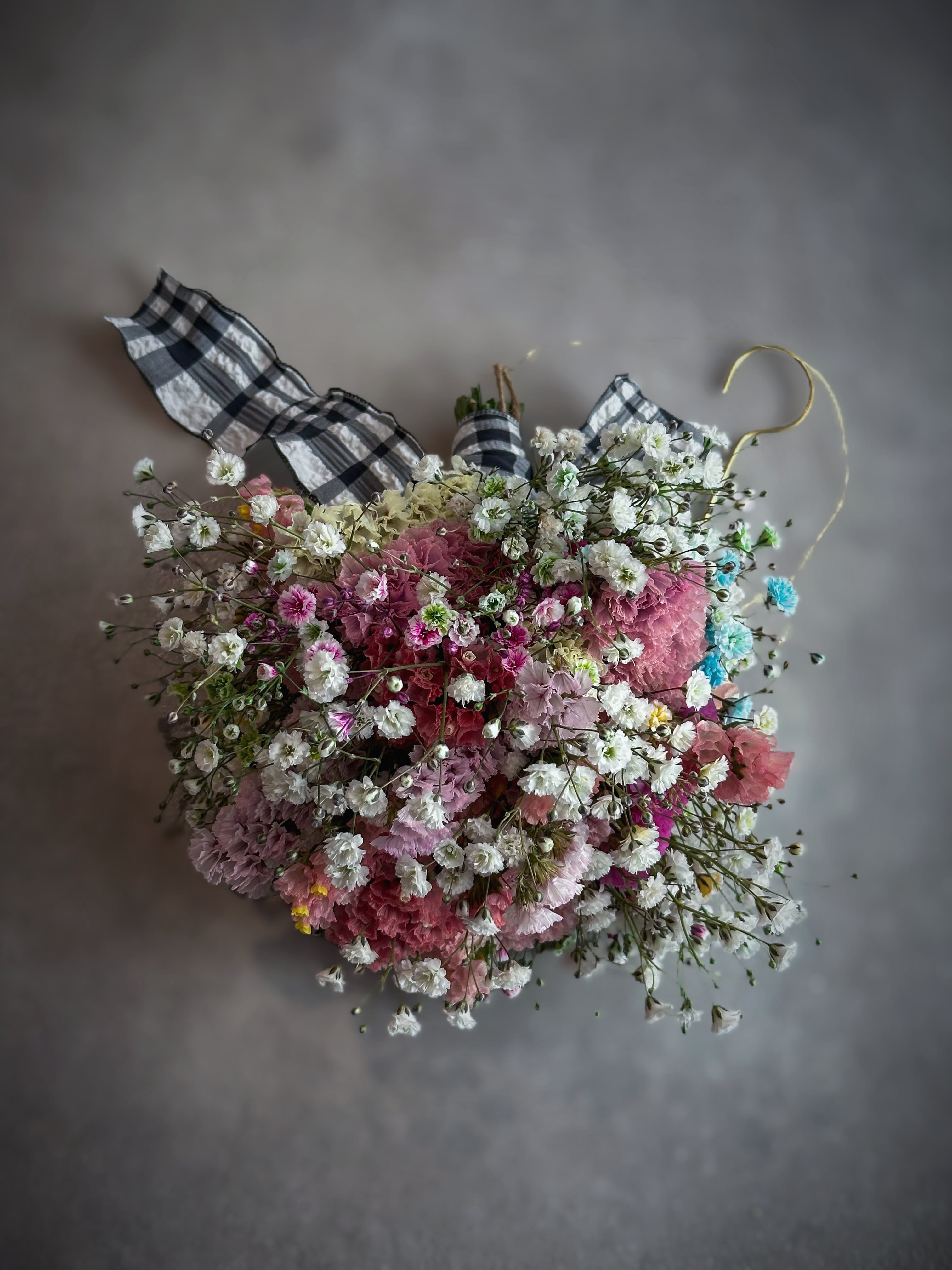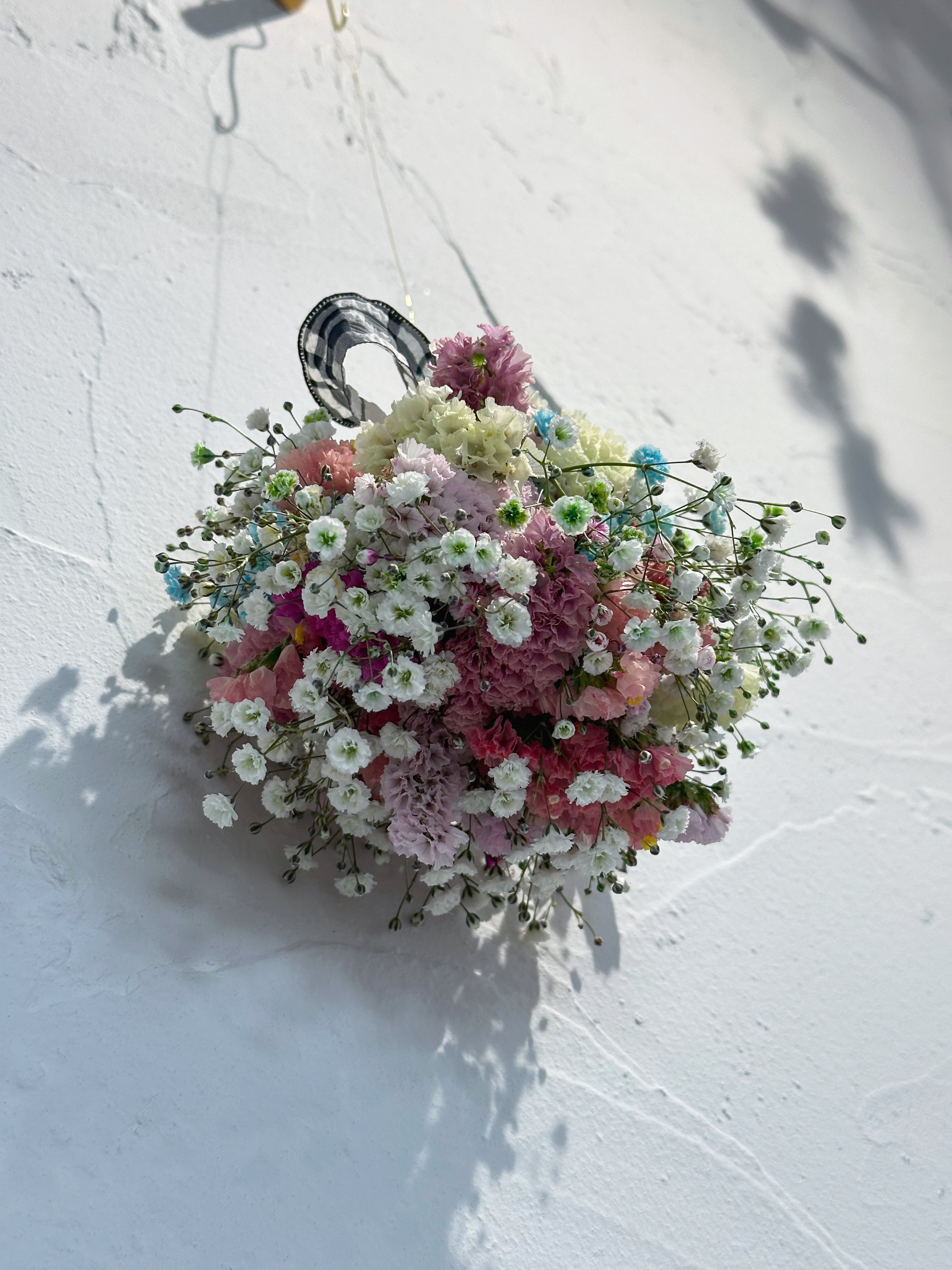 ✔mini フライングブーケ (16cm前後) どの角度から見ても可愛いシルエットなので、 天井や壁からフライングしても、 フラワーベースに入れて飾っても◎ 空間にふんわり春色をプラスしてくれる ミニサイズのブーケです