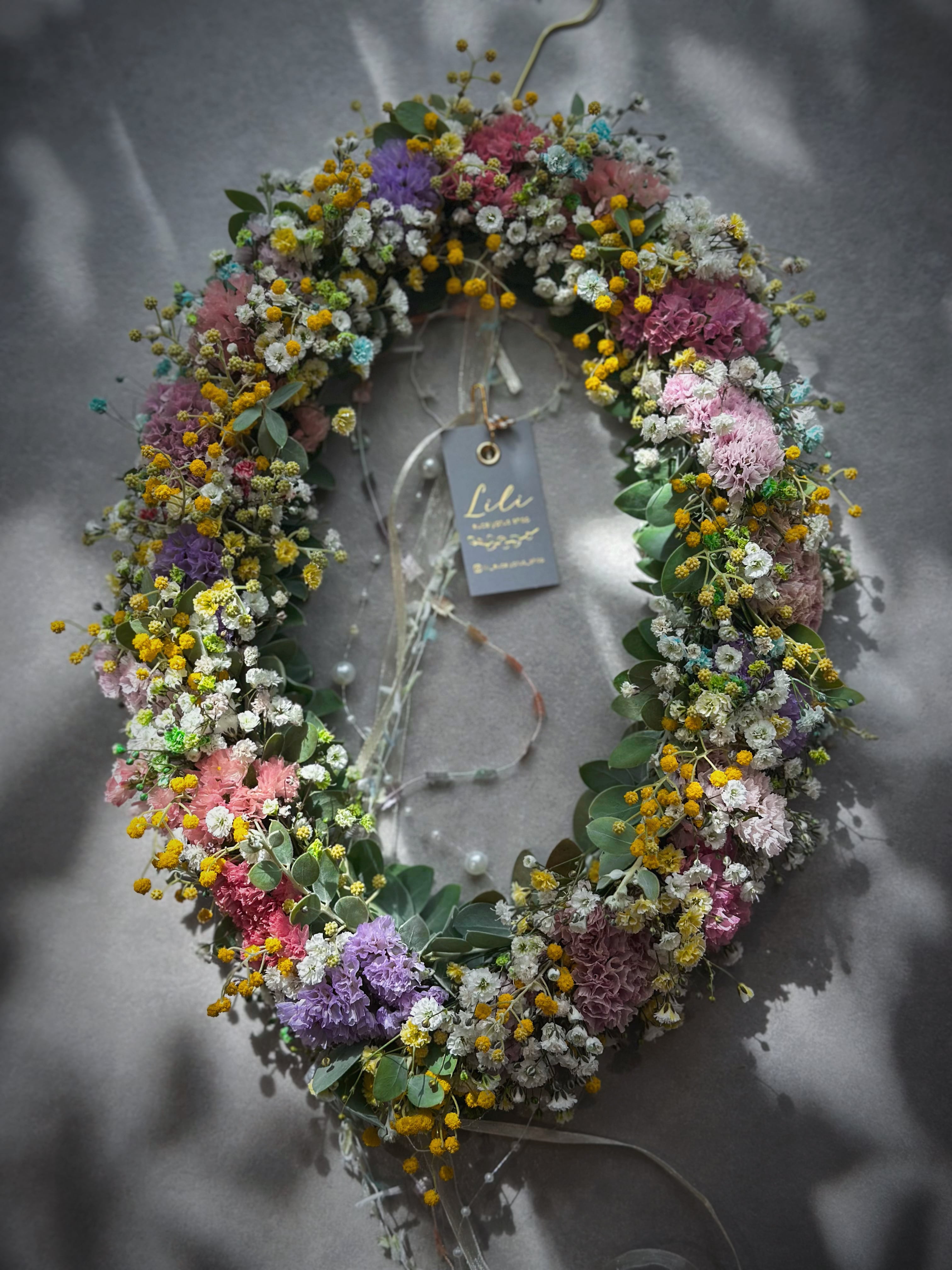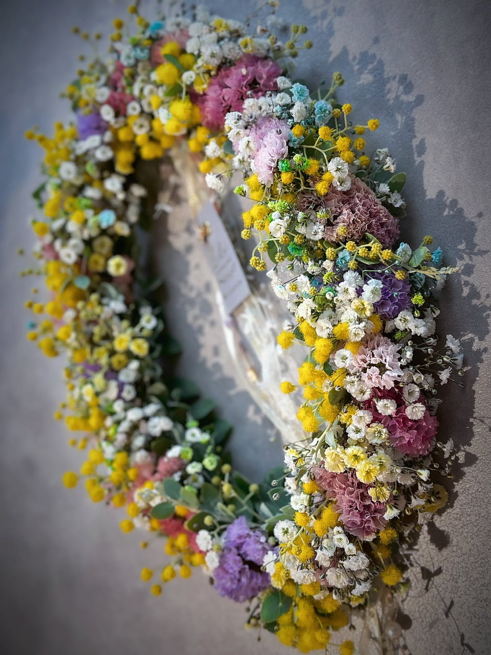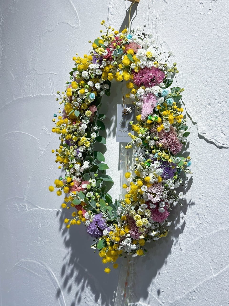 パールアカシアのお花と蕾、ニュアンスチース(ビンテージピンク、くすみピンク、ピンクオレンジ、薄パープル、赤etc…)、カラーかすみ草(ホワイト、ブルー、イエロー、グリーン)入りで春色カラーがとってもかわいいオーバルリース