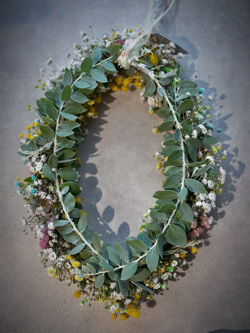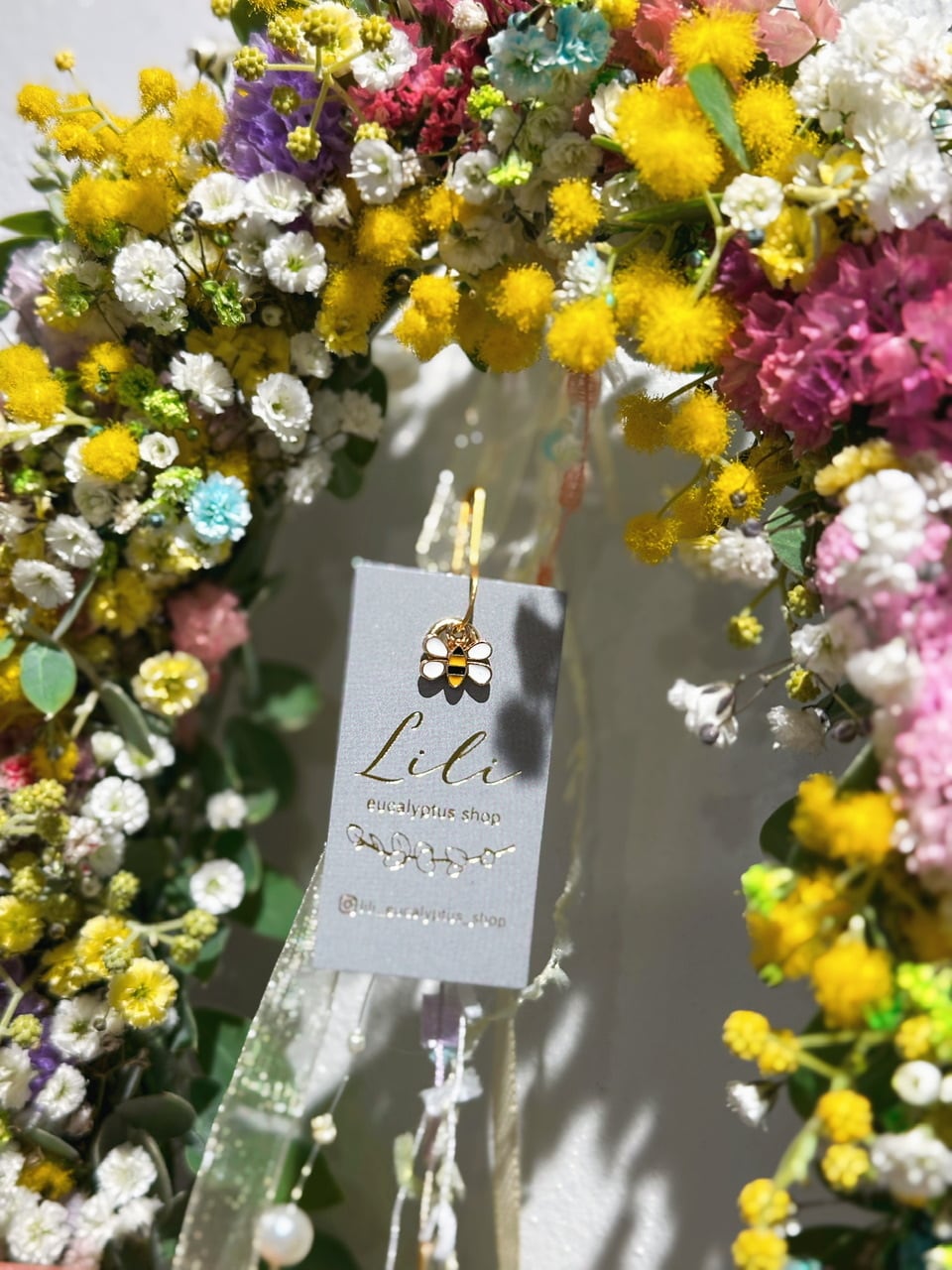 裏側にもパールアカシアの葉を付けているので、壁掛けはもちろんフライングしても飾っていただくことが出来ます