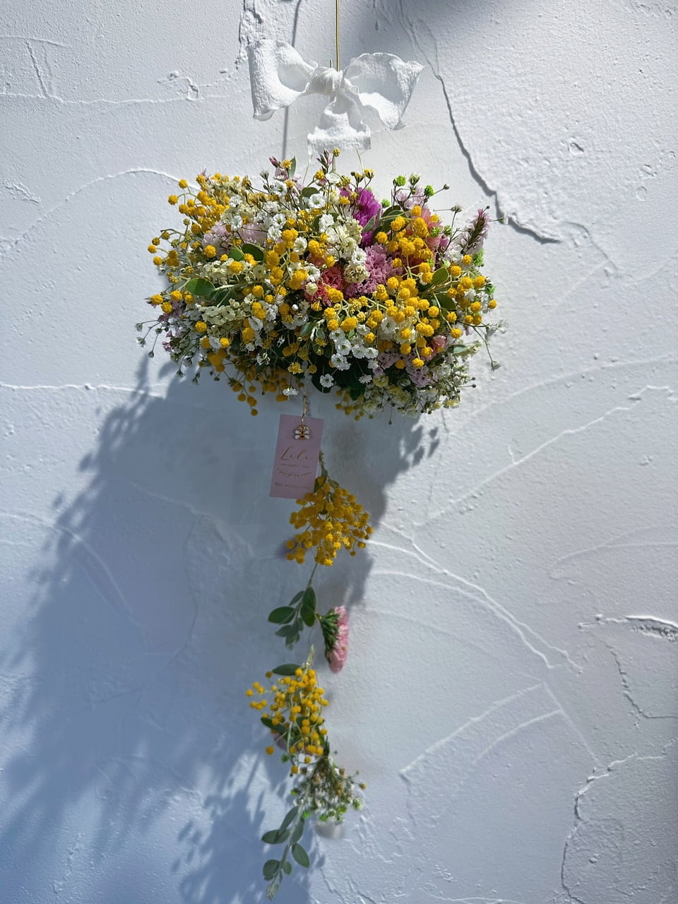 春色カラーのお花を合わせて制作しました。パールアカシア、ニュアンスチース、カラーかすみ草、HBチース etc…