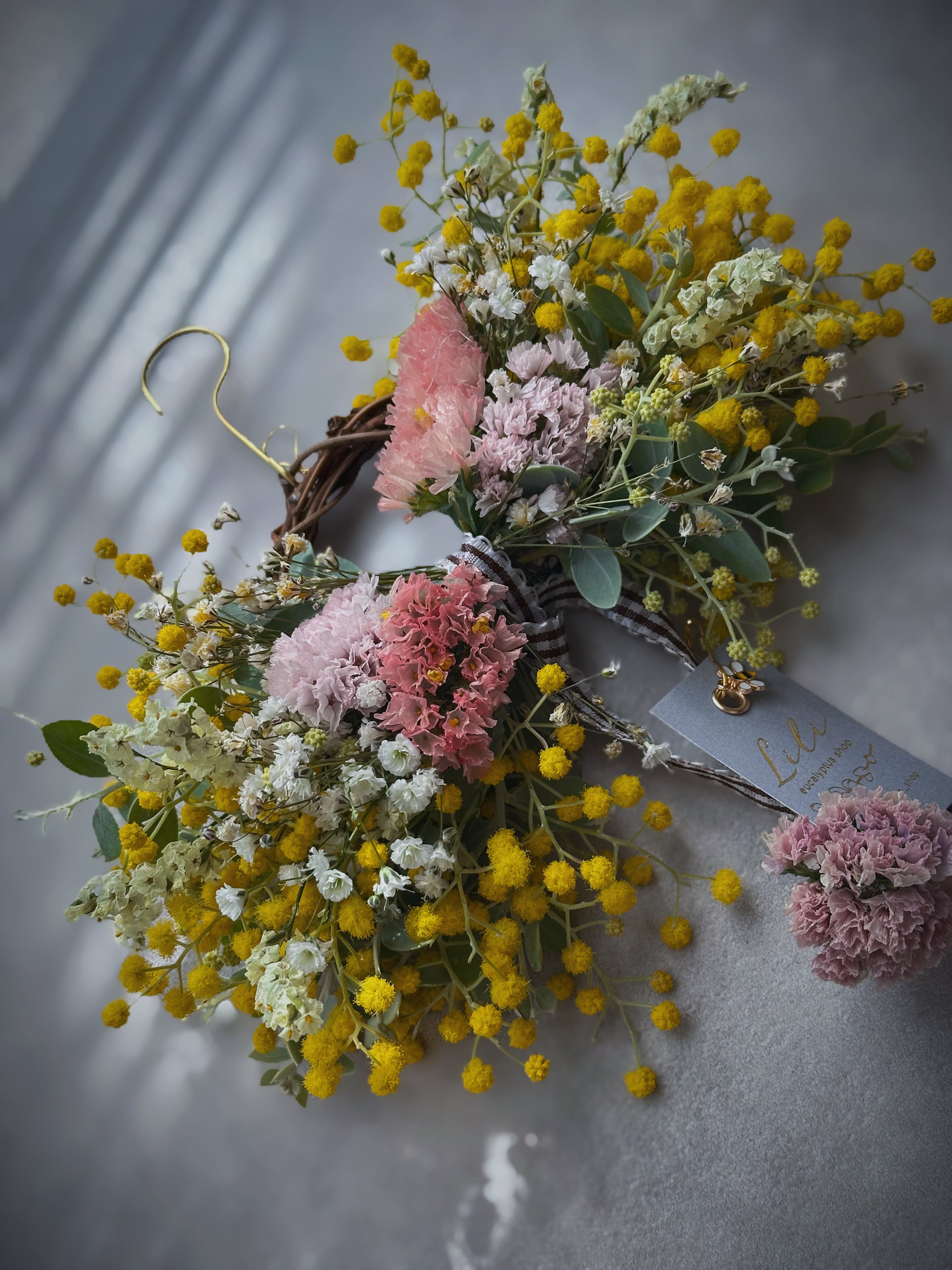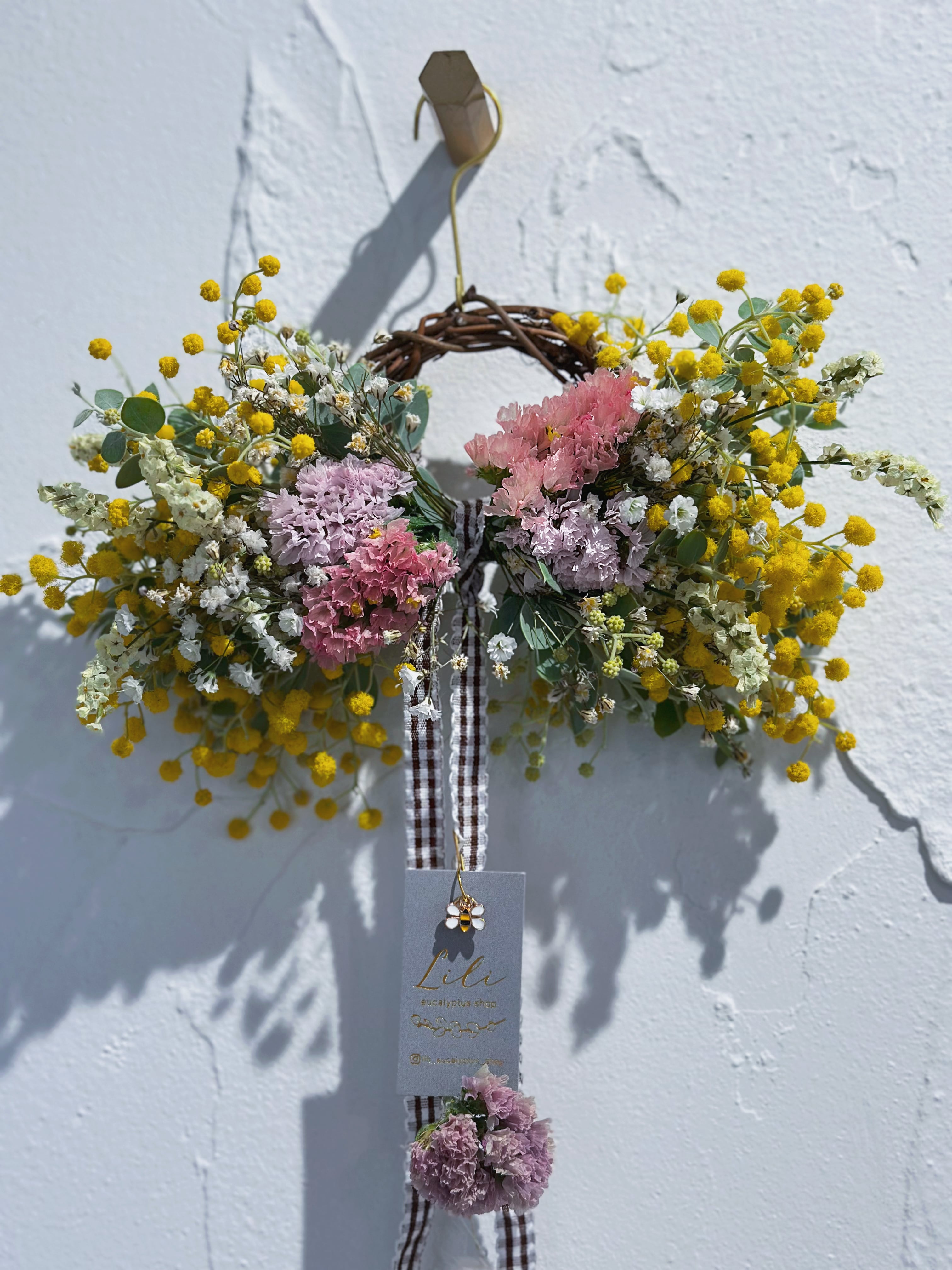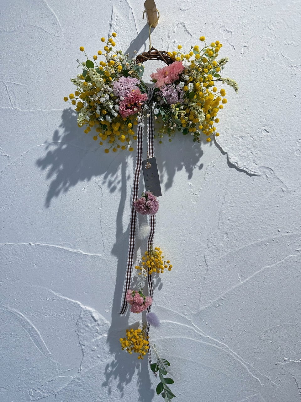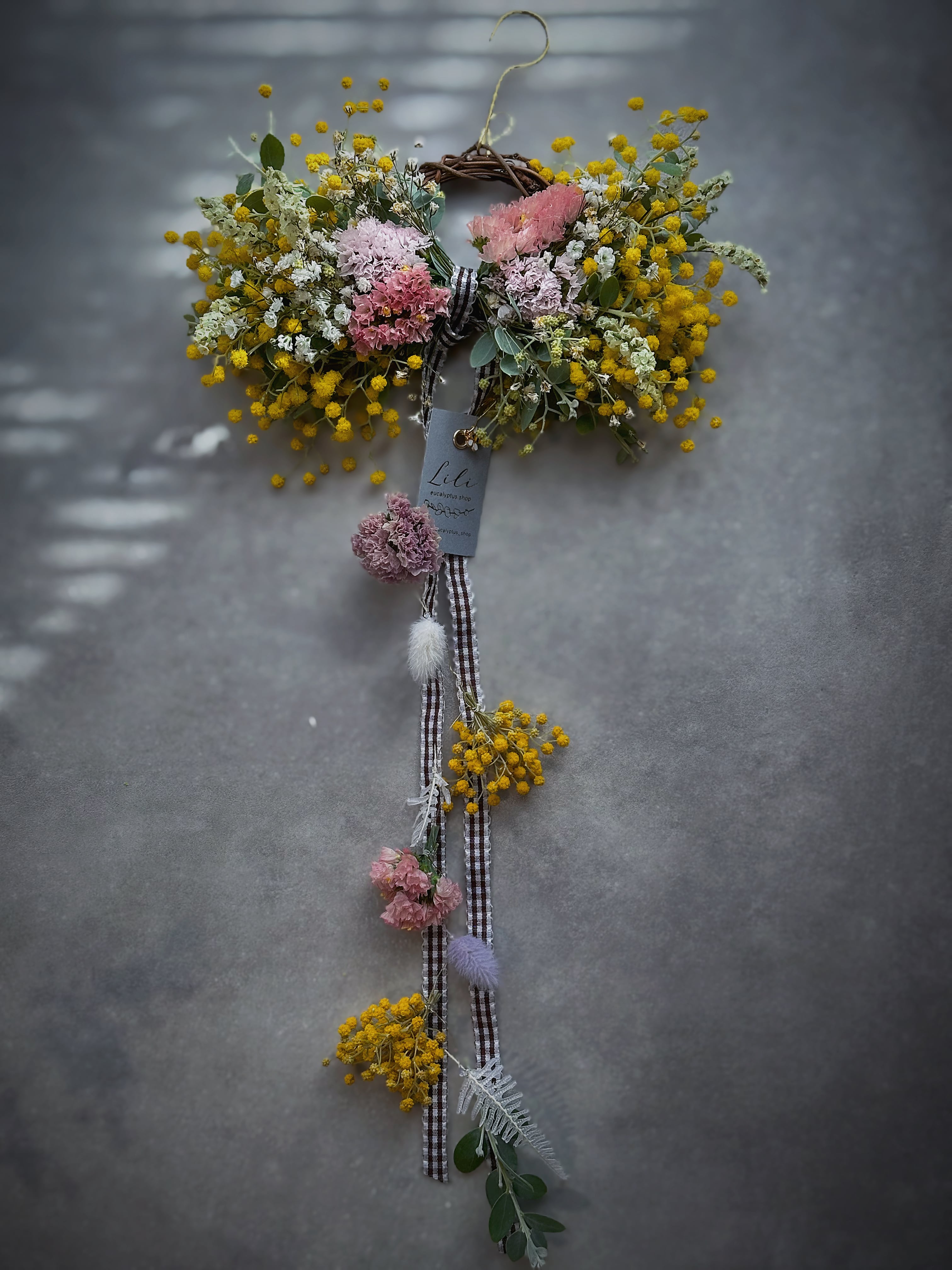 ✔リボンリースのフラワーモビール (リース横20cm / 上から下まで約50cm) パールアカシアをメインに、春色カラーの小花やニュアンスチースを入れてワイヤリングしています。 ポワポワは、分かったつもりでいても想像以上に縮むので 落ち着いてからグルーガンで少しずつ足しています。 パールのような粒になってくると、これがまた可愛いのです。
