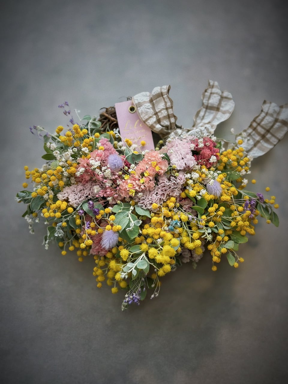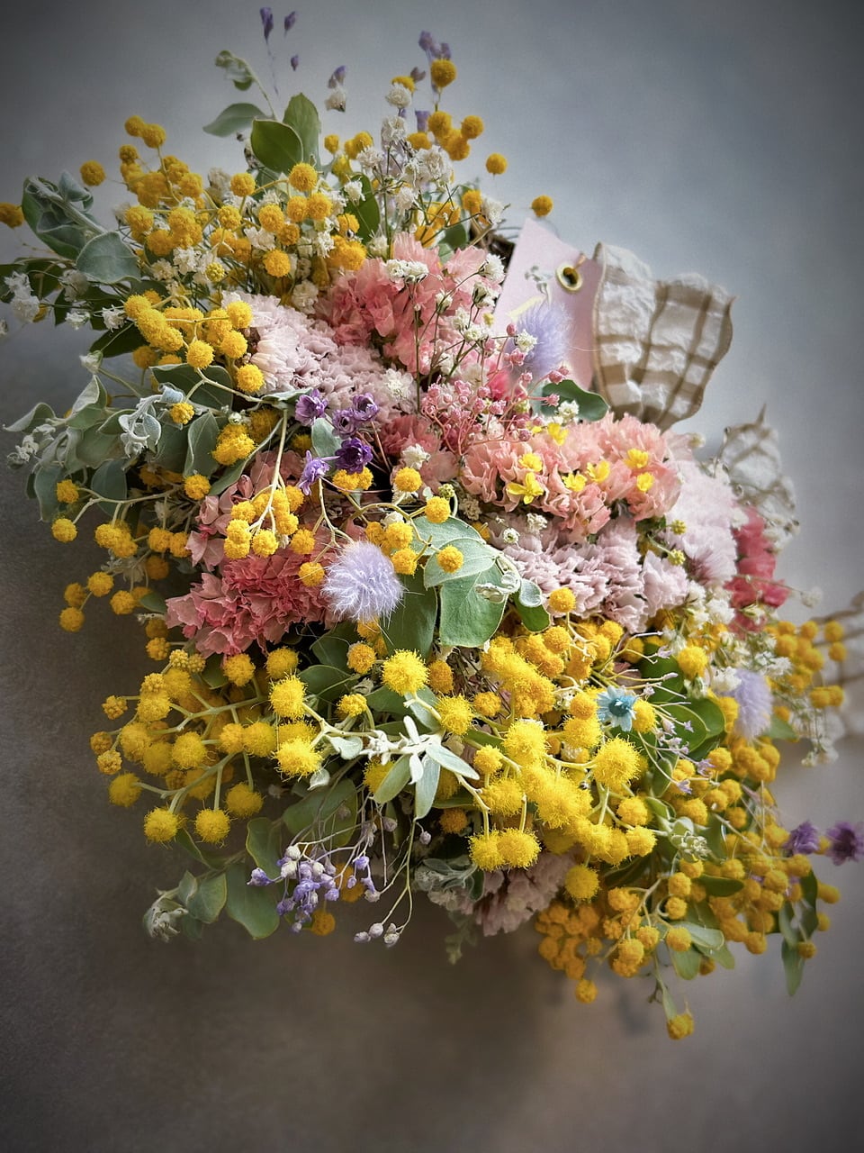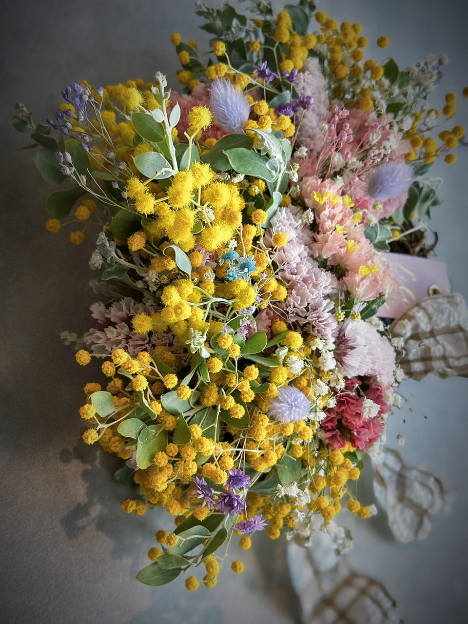 パールアカシアをメインに、ニュアンスチースやカスミソウ、プリザーブドフラワー、ラグラスを合わせて仕上げました。