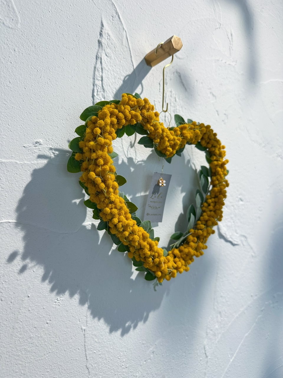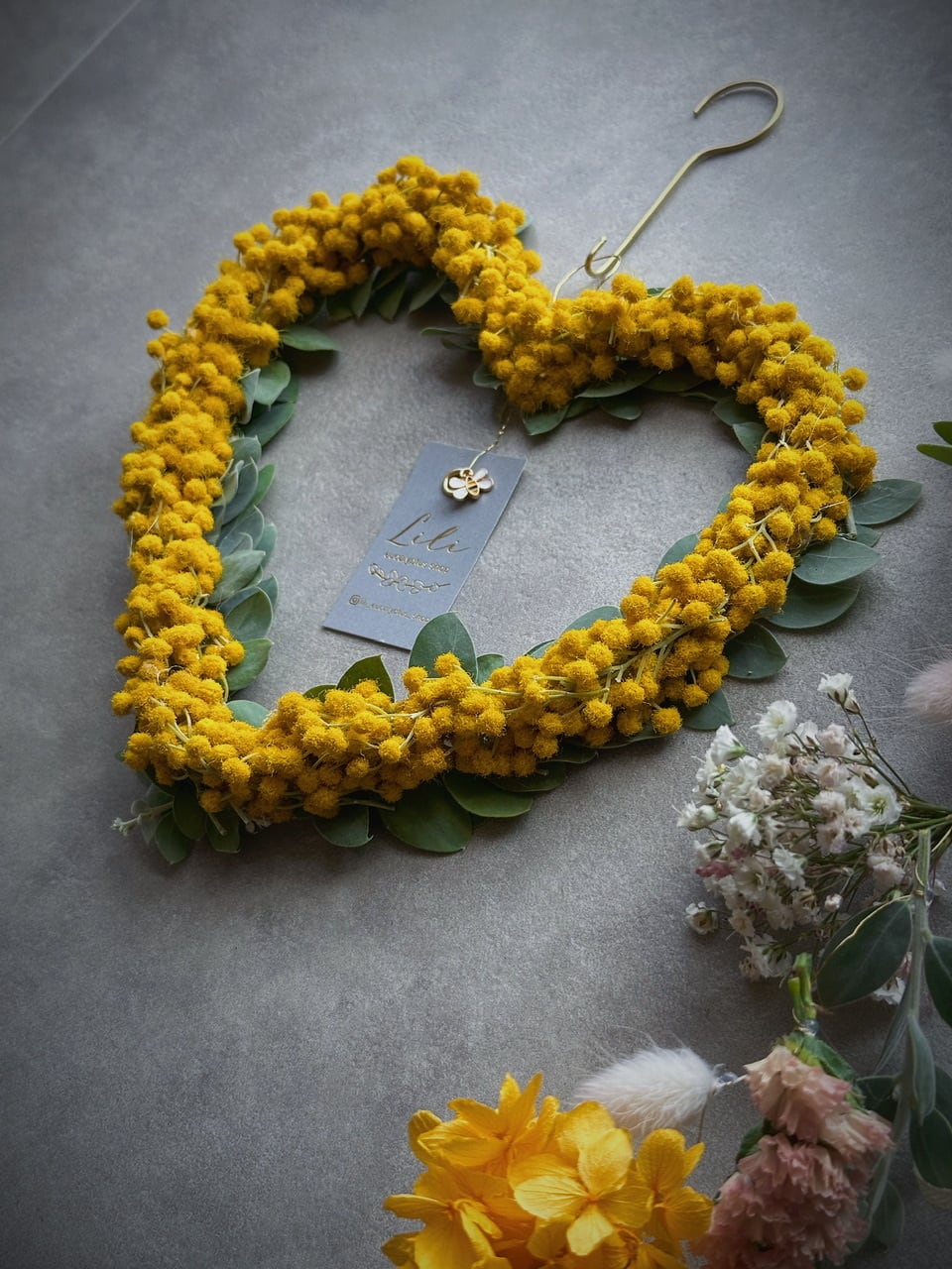 こちらのリースは丁寧にパールアカシアの粒を少しづつ重ねて仕上げた、繊細なリースです。