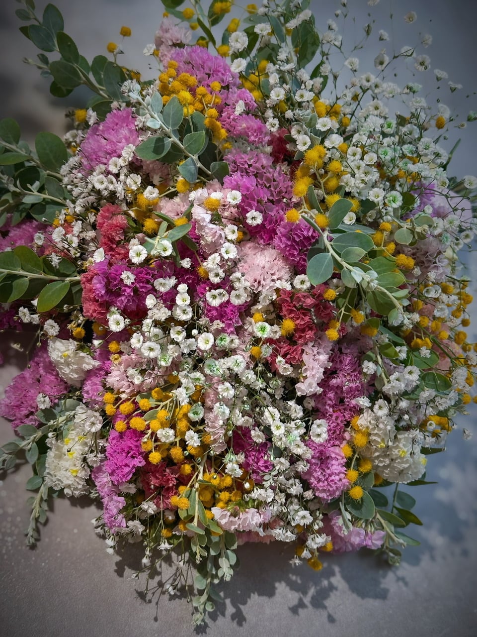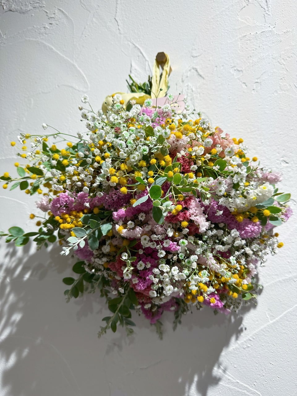 春色カラーのスターチスに、カラーカスミソウ、パールアカシアをボリュームをボリューム満点に束ねました